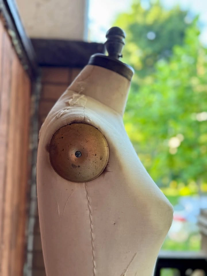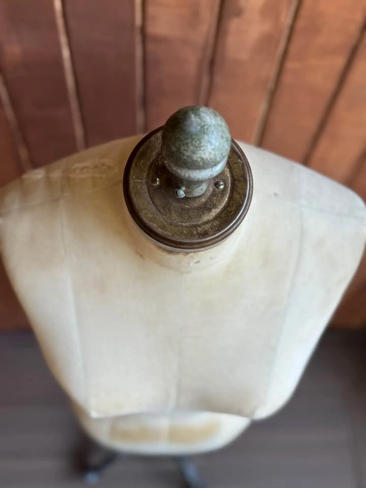 Rare 1950's era Vintage Women’s Dress Form Mannequin. Great as a decor piece/sewing or clothes displaying. Use as a statement decor piece or display if you own a clothes boutique. Perfect for draping, fashion design, teaching and pattern making. The metal base has four legs with original wheels and is marked " Toronto" and "Canada " on two opposing sides. Marked with a faded Size 10 Has knob to adjust height on wheels. Waist 25” Shoulders 15" Hips 36” Dimensions: 56” H 13” W 9” D Wear consistent with age. Shabby chic Of things past One of a kind Store display Clothes display clothing display dress making sewing fashion design tailoring Original form Mannequin Women dress form Women dress form mannequin Interior Decor Rustic