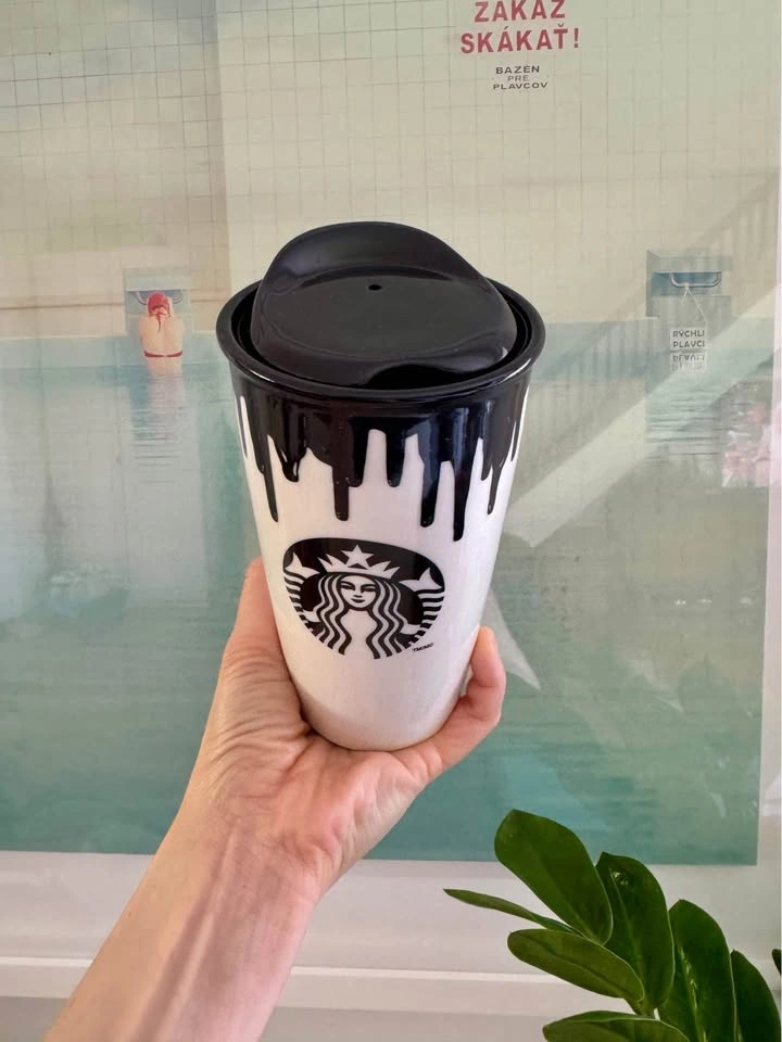 Highly collectible and hard to find Starbucks 2014 Band of Outsiders 12 oz. Travel Cup Tumbler Ceramic Black Drip. Comes with Ceramic lid! Great Condition- like new!