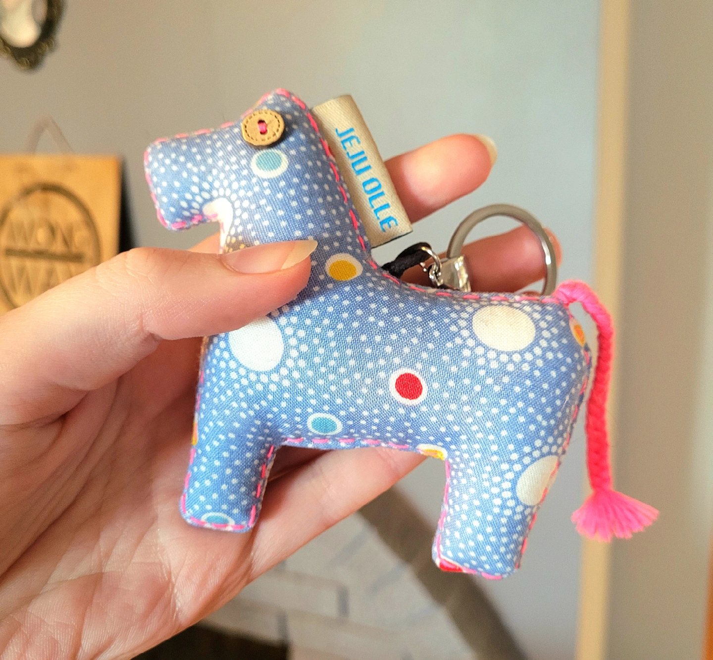Cute Jeju Olle horse keychain! It's blue with white polka dots and a pink tail. Perfect for adding a touch of whimsy to your keys or bag