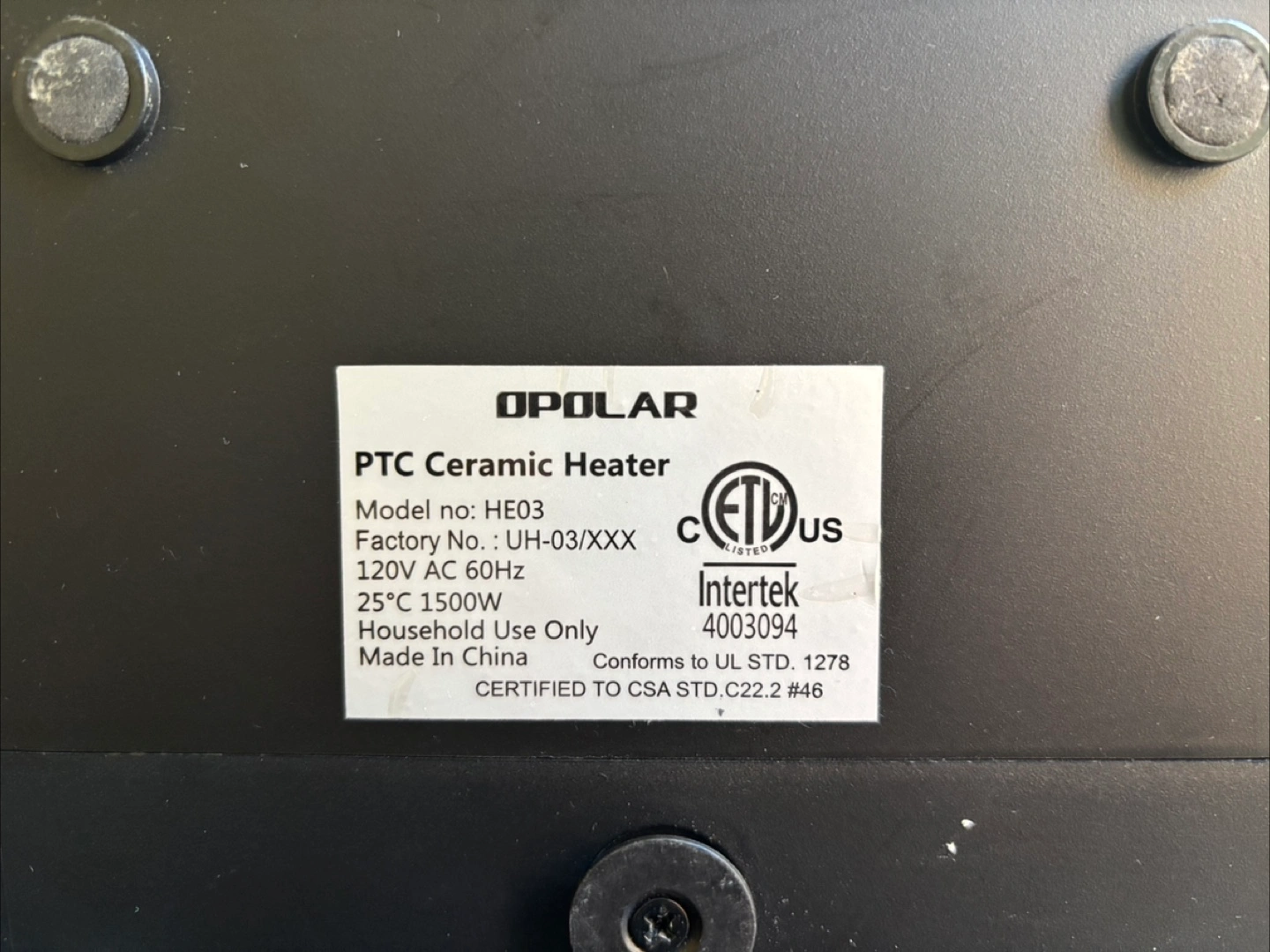 Selling an OPOLAR PTC Ceramic Heater, model HE03. It's a 120V AC 60Hz heater, made for household use. It has a high and low setting, and a safety to turn it off if it gets knocked back.