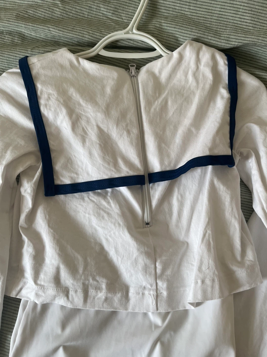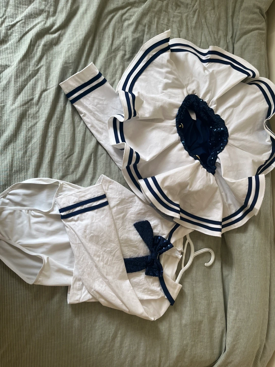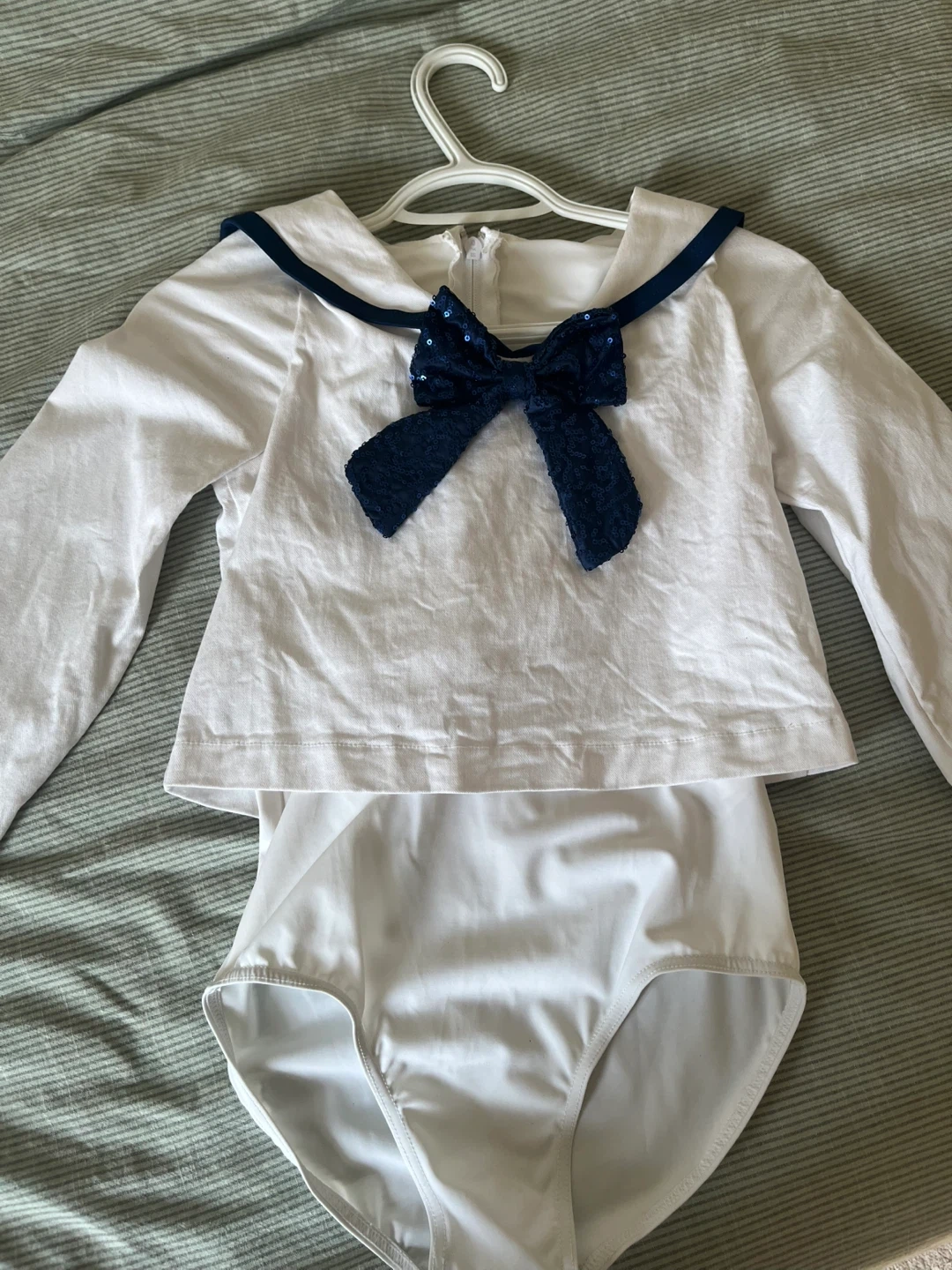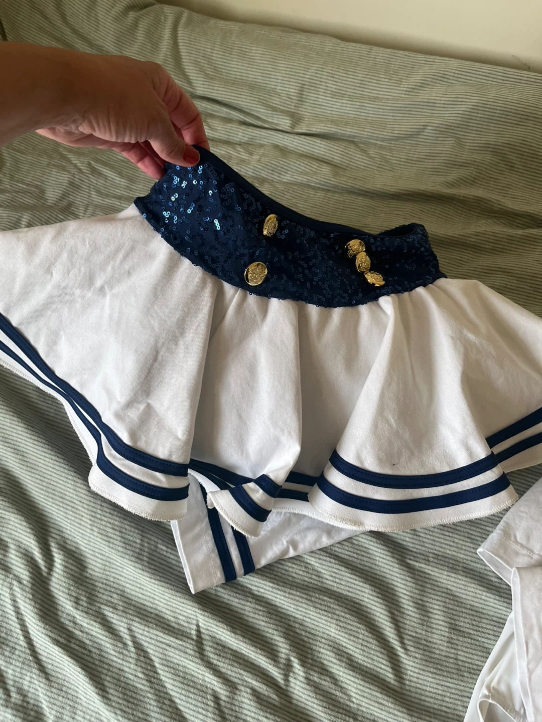 Selling a cute sailor outfit! It includes a skirt with a blue sequin waistband and gold buttons, a long-sleeve top with a blue bow, and matching bottoms. Perfect for dress-up or a costume party or dance costume.