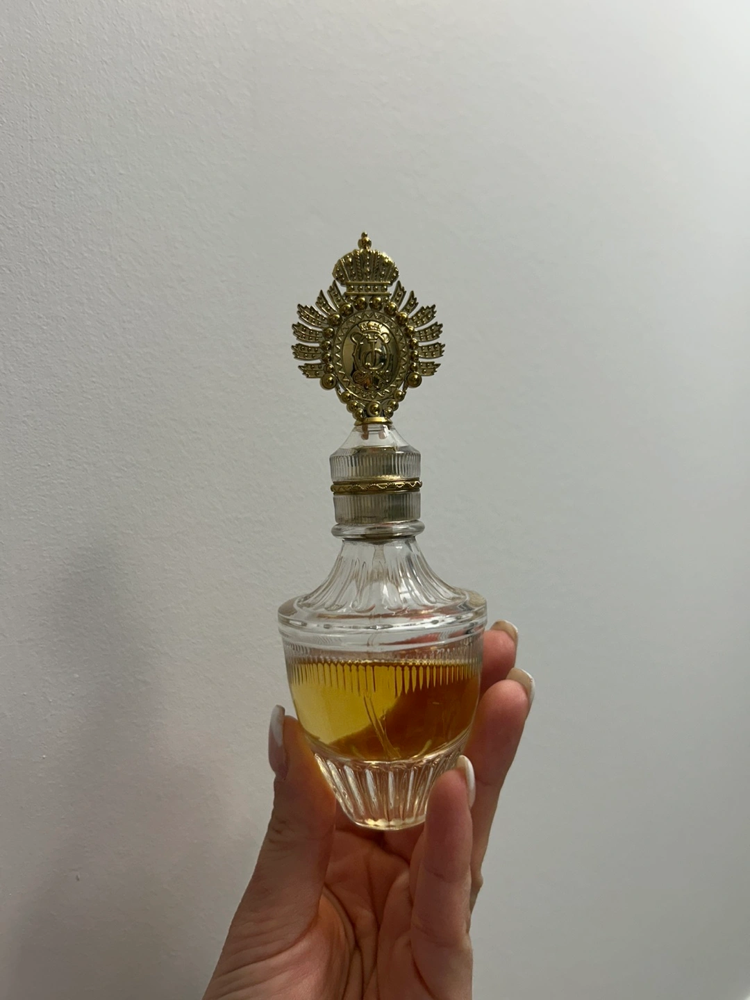 Selling a vintage Juicy Couture perfume bottle! It's a beautiful piece with a unique design and a gold-tone emblem on top. Perfect for collectors or anyone who loves vintage perfume bottles!