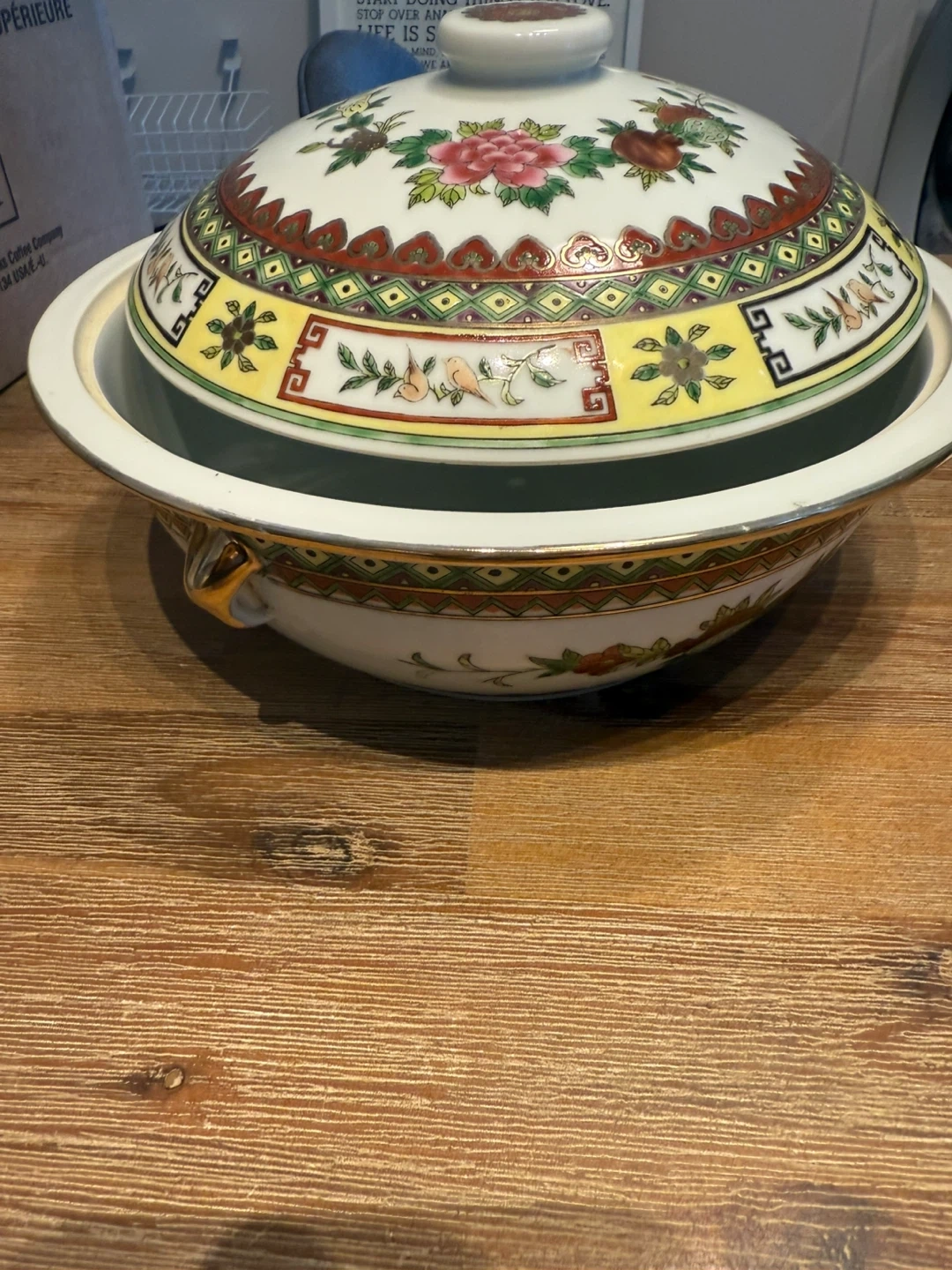 This is a lovely vintage Chinese covered serving bowl. It features a colourful floral design and gold accents. The bowl is in great condition and would be a beautiful addition to any table setting