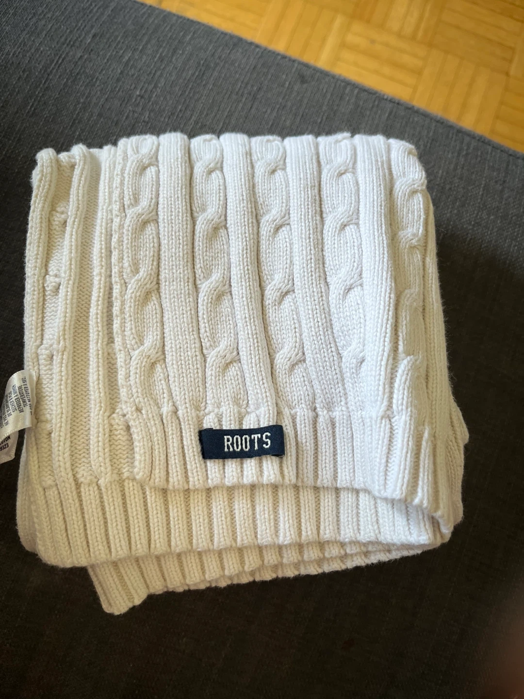 Cozy up with this cream-coloured knit scarf from Roots! It's in great condition and ready to keep you warm during those chilly Canadian days