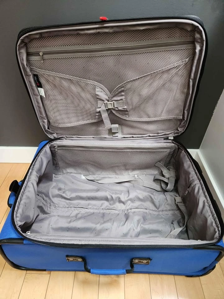 Selling a 25" Delsey Helium Lite 100 expandable suiter trolley luggage in good condition. Has some fraying of the material due to use & a broken zipper tag. This does not affect the function of the luggage - there are no rips or tears and the zipper works fine. Staining is also noted on the material due to use.