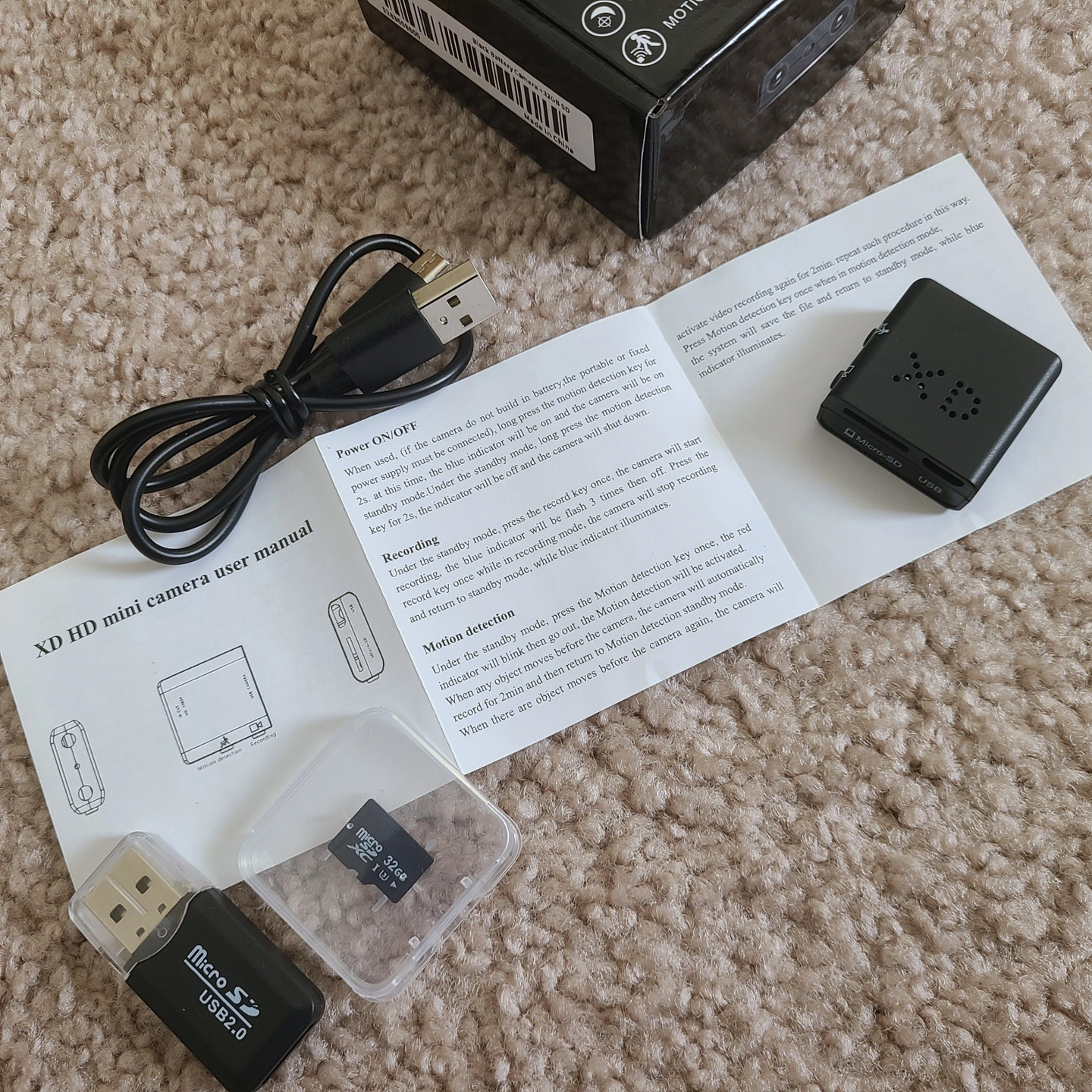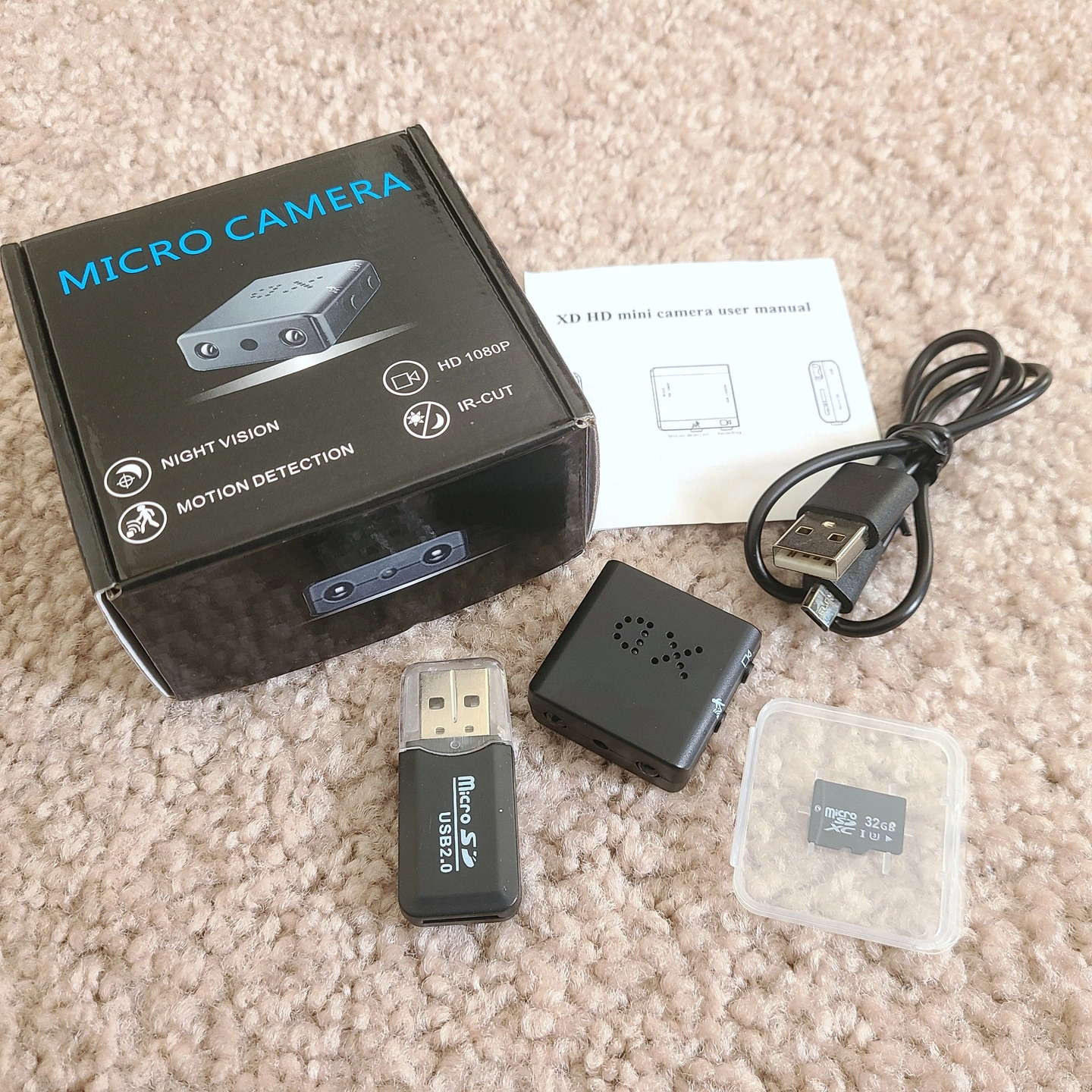 - Package includes: Mini camera, 32GB microSD card, USB microSD reader, recharging cable, user guide