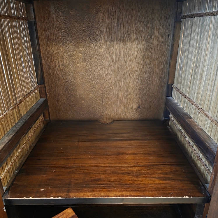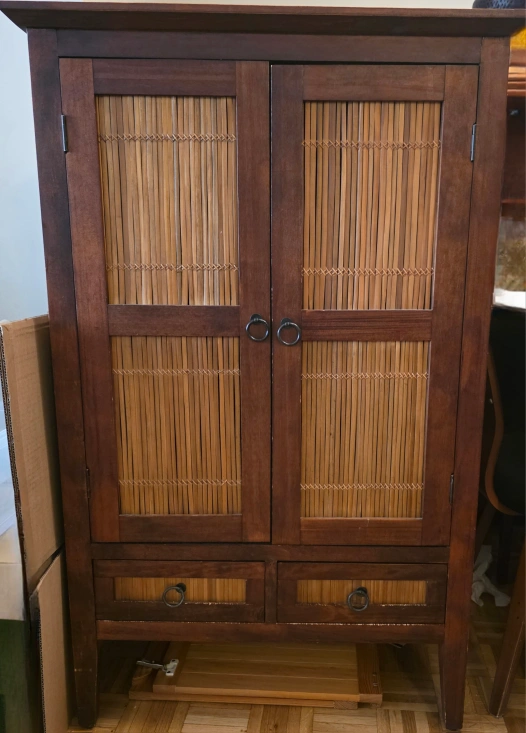 Vintage Pier 1 wooden cabinet with bamboo detailing on the doors. It features 2 drawers at the bottom and lots of space for storage.