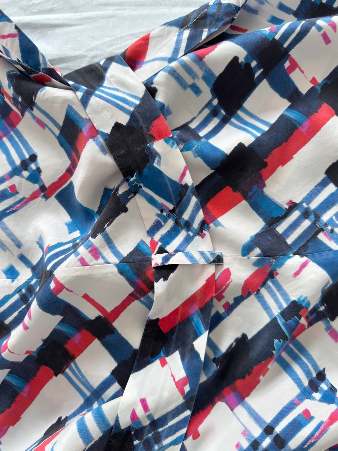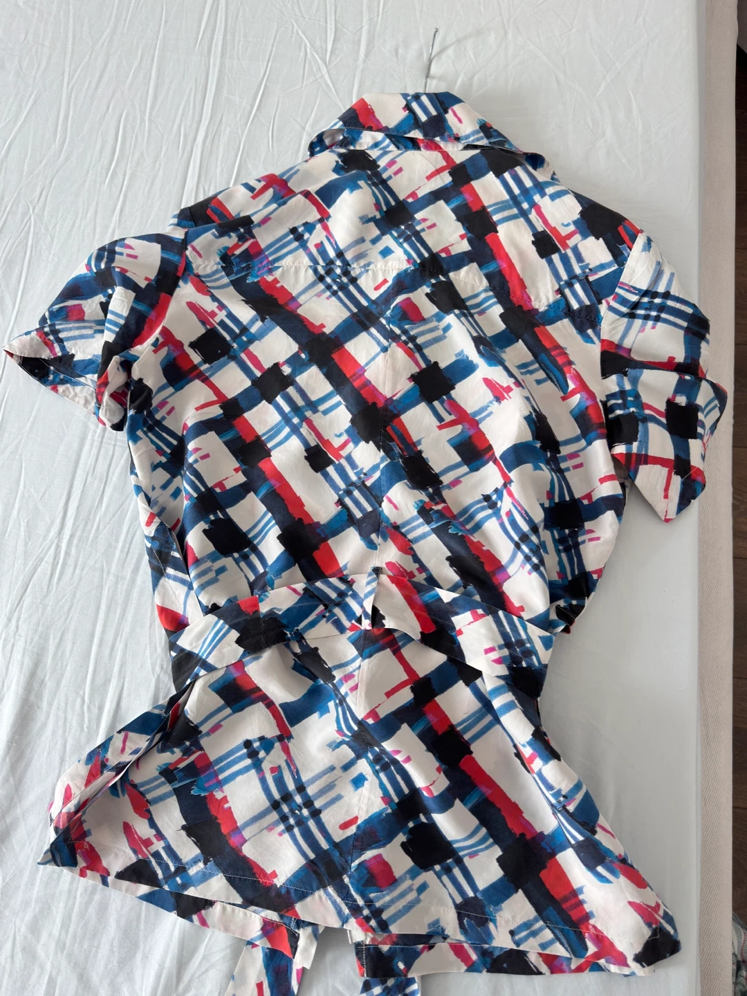 Selling a stylish authentic Chanel shirt with a unique multicolor pattern. The shirt is size 38 and features a collared design with short sleeves. Perfect for adding a touch of designer flair to your wardrobe!