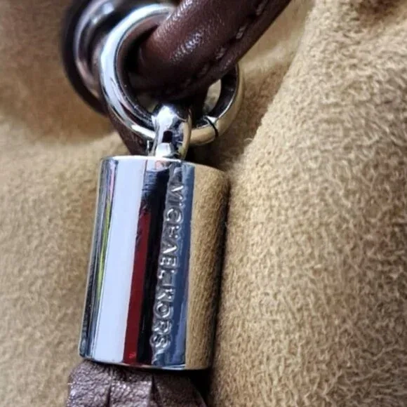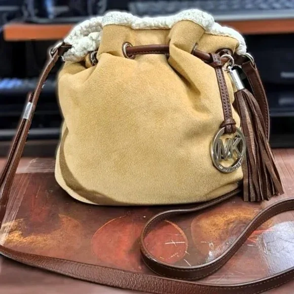 Small Michael Kors Faux Shearling Sling Bag, big fashion statement. It has an adjustable genuine leather strap, removable silver-tone metal MK logo hardware in a leather hang tag and a brown tassel detail. It has creamy faux shearling interior. This stylish bag is not only a fashionable accessory but also practical for daily use. Its spacious make it easy to organize essentials while adding a touch of elegance to any outfit. This sling bag is a classic addition to any wardrobe. Its versatile design making it a practical choice for any occasion. Gently used and well kept. Clean exterior and interior. No damage. Minimal sign of wear.