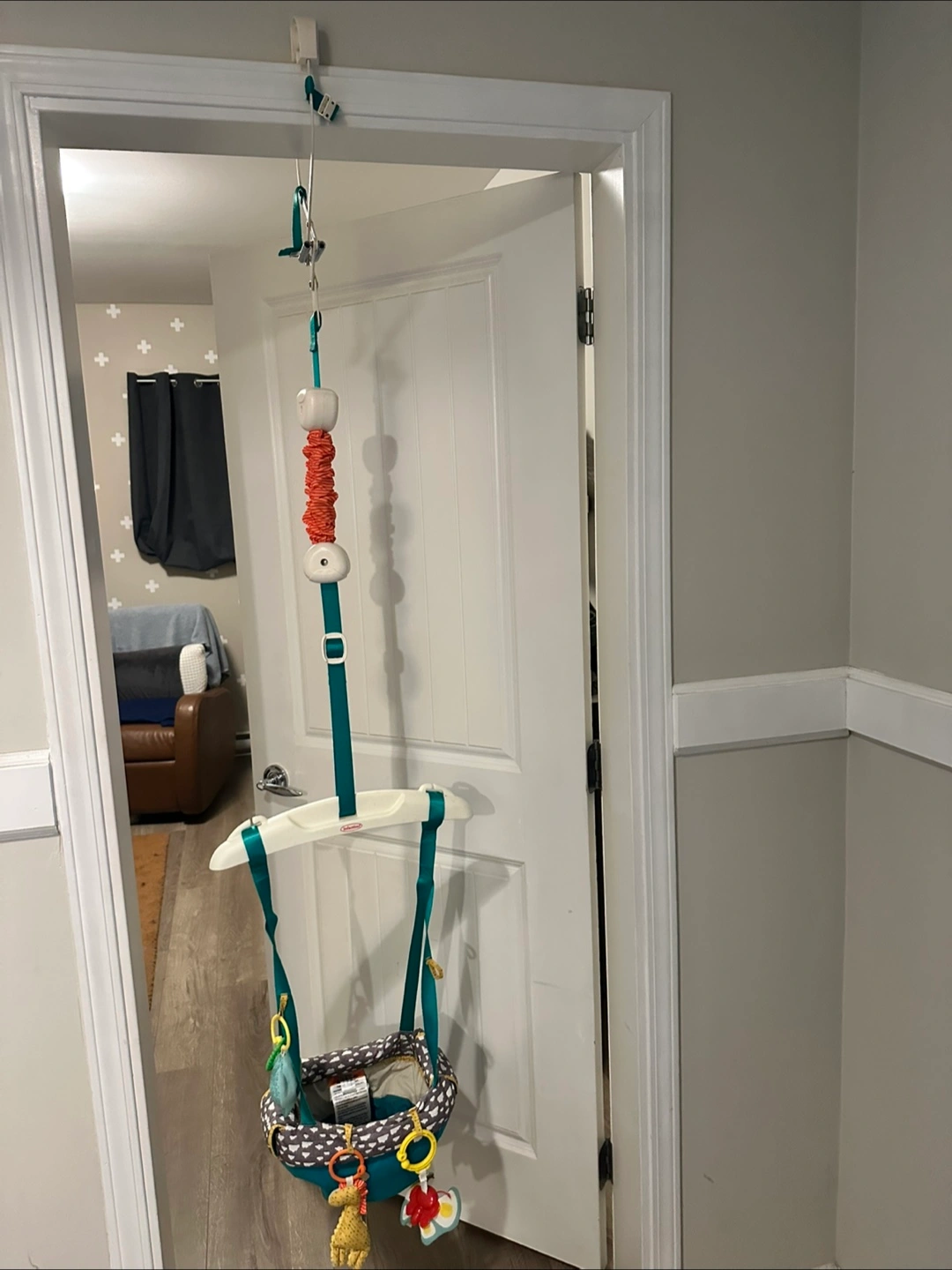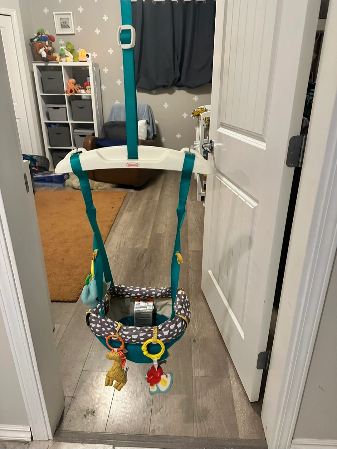 Infantino doorway jumper for your little one! It's in great condition. This jumper easily attaches to most door frames, providing a safe and fun way for your baby to bounce and play. Comes with cute, colourful toys to keep them entertained!