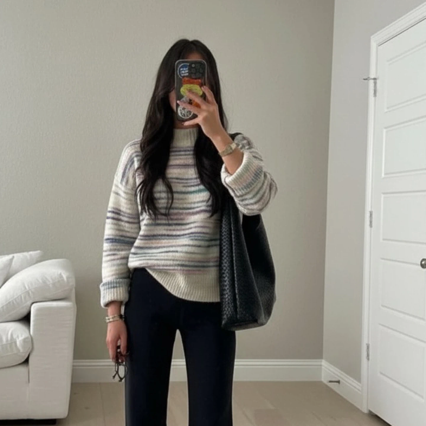 This is a cute striped knit sweater from Old Navy! It's a size small and features a mock neck. Perfect for layering or wearing on its own on a cool day