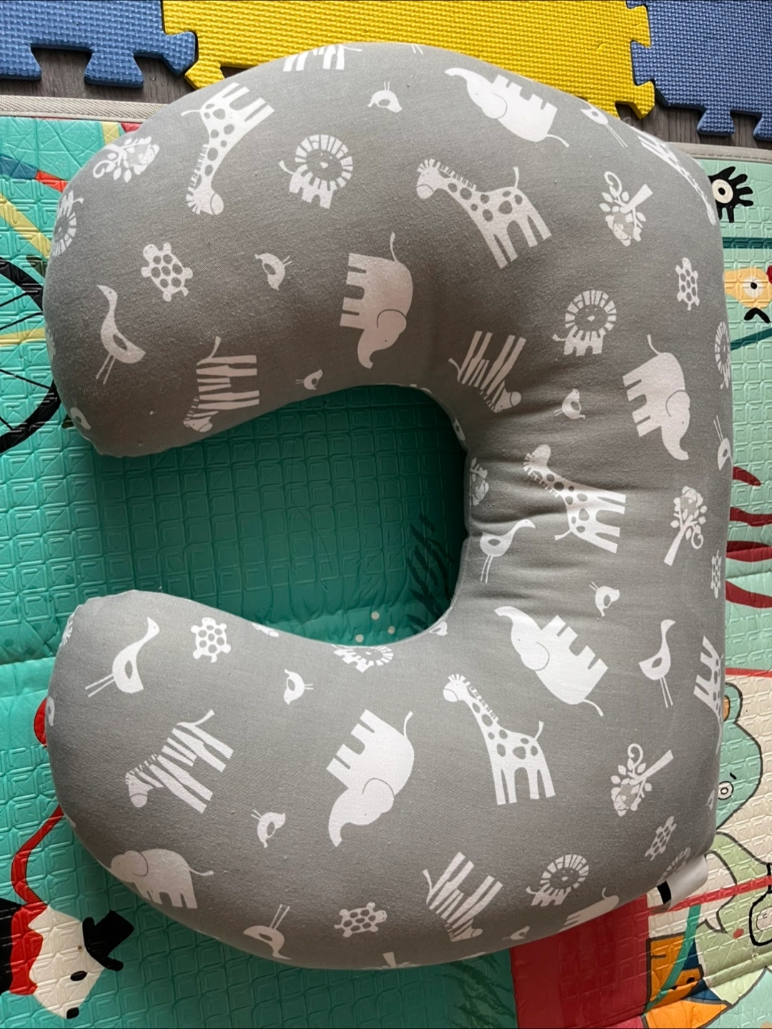 A gently used Boppy pillow in great condition! It features a cute grey fabric with an animal print design. Perfect for feeding or tummy time for your little one