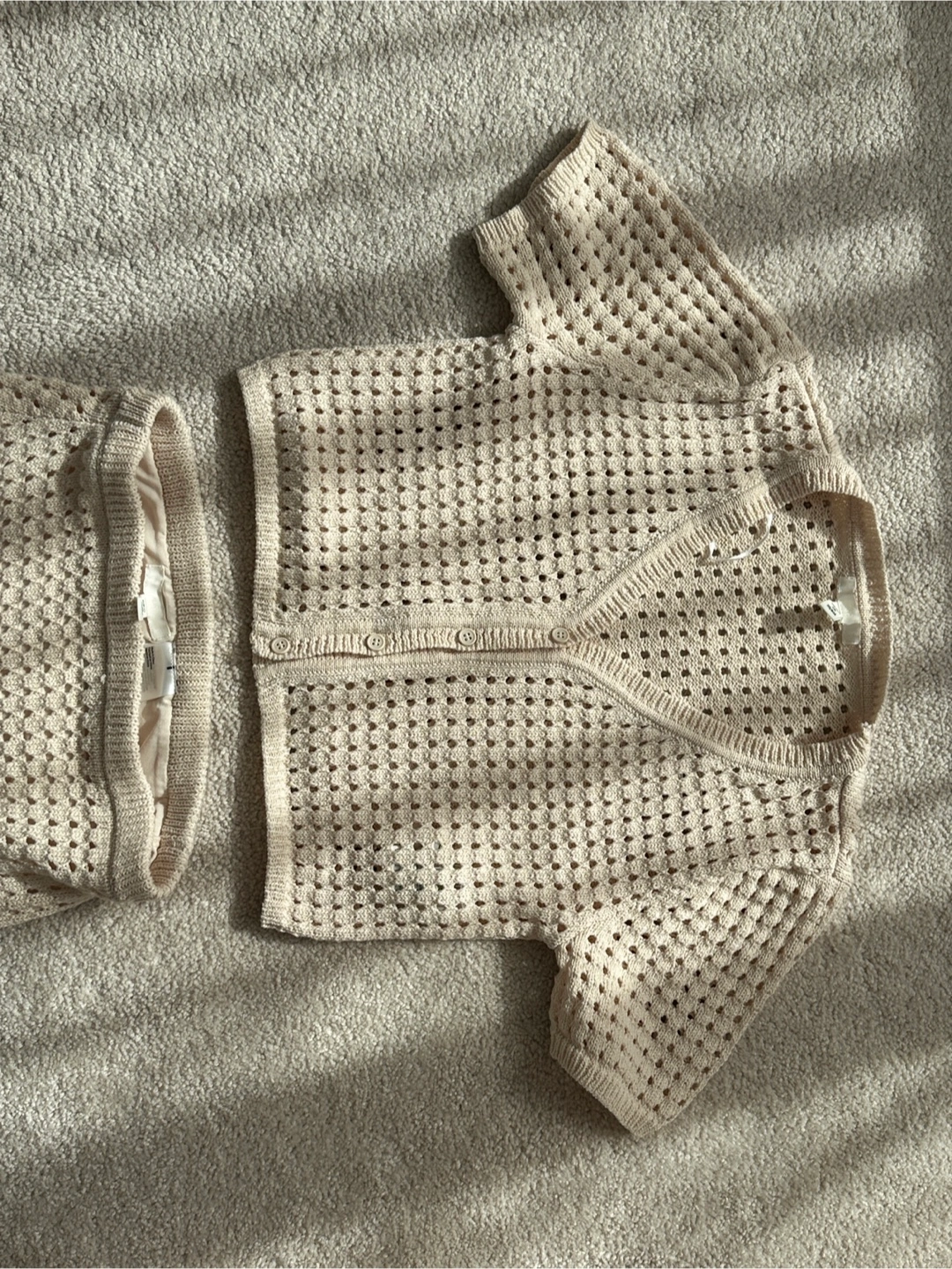 Selling a cute knit cardigan and skirt set! It's a lovely beige colour and looks great together or as separates. Perfect for a casual day out or dressing up for a special occasion. The material is soft and comfortable, making it a great addition to any wardrobe
