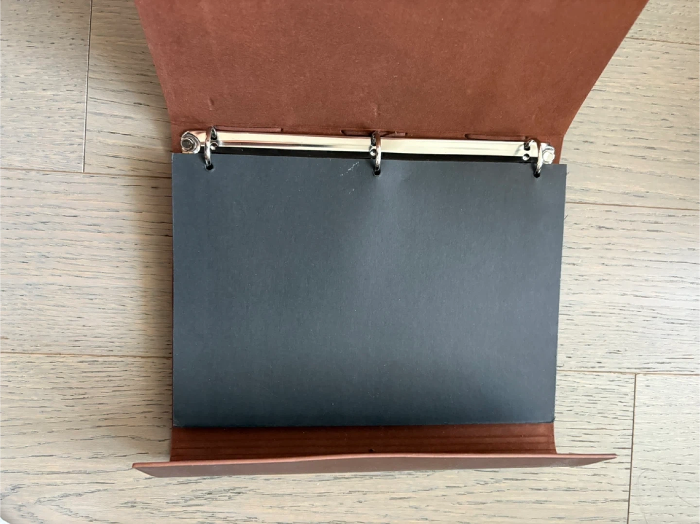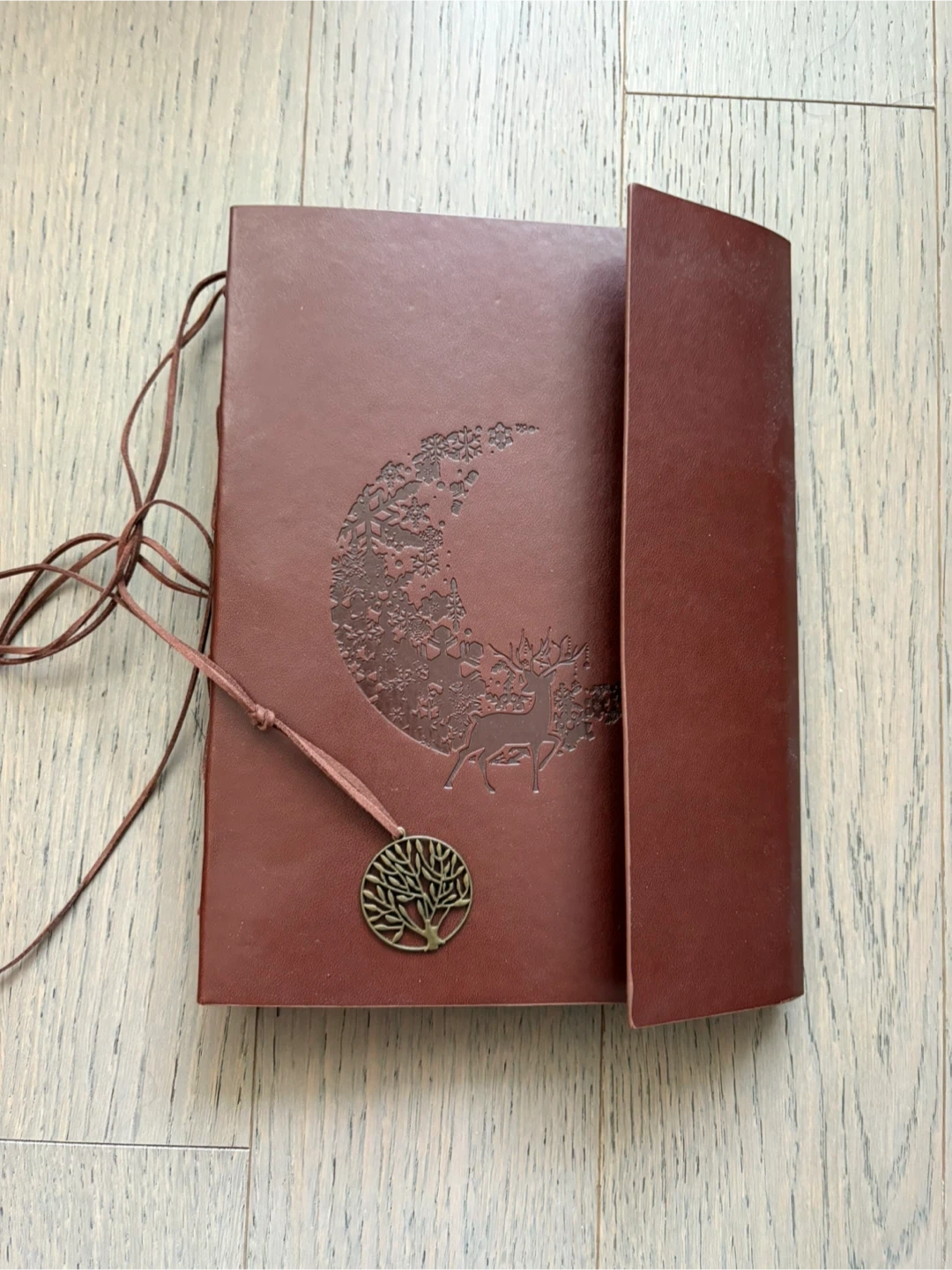 Selling a lovely brown leather journal. It features a unique deer and moon design on the cover, along with a charming tree of life pendant. The journal has a ring binder inside with black pages, perfect for sketching or journaling. It's in great condition and ready for a new owner