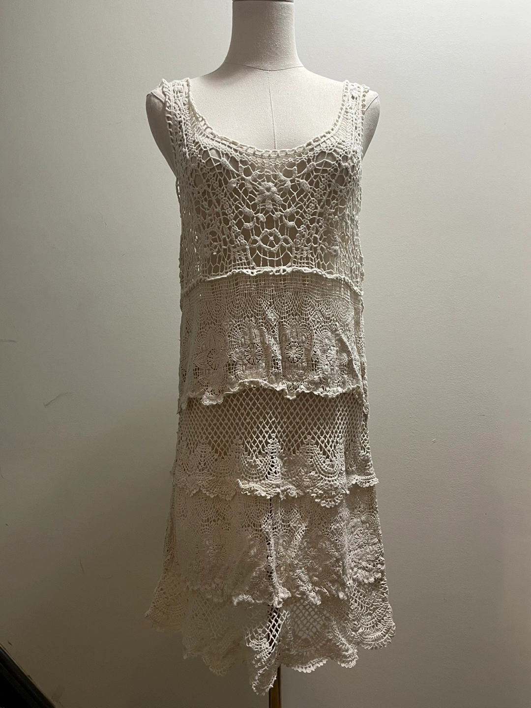 Selling a ivory-coloured crochet dress. It has a lovely layered design and is perfect for summer!