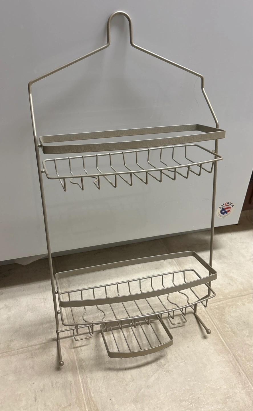 Shower caddy with multiple shelves for organizing your shower essentials. It hangs over the shower head for easy installation and space-saving storage.