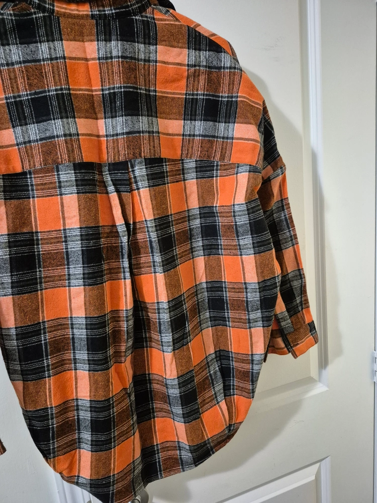 Here's a comfy flannel shirt from Urban Outfitters! It features a classic plaid pattern in orange, black, and white. Perfect for layering or wearing on its own!