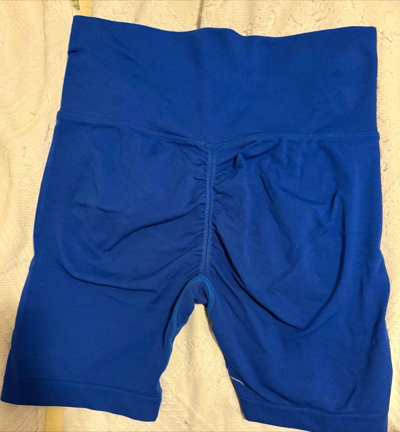 Selling a pair of blue seamless athletic shorts. Size M. They are brand new condition and perfect for workouts or everyday wear! The material is comfortable and stretchy, making them ideal for any activity