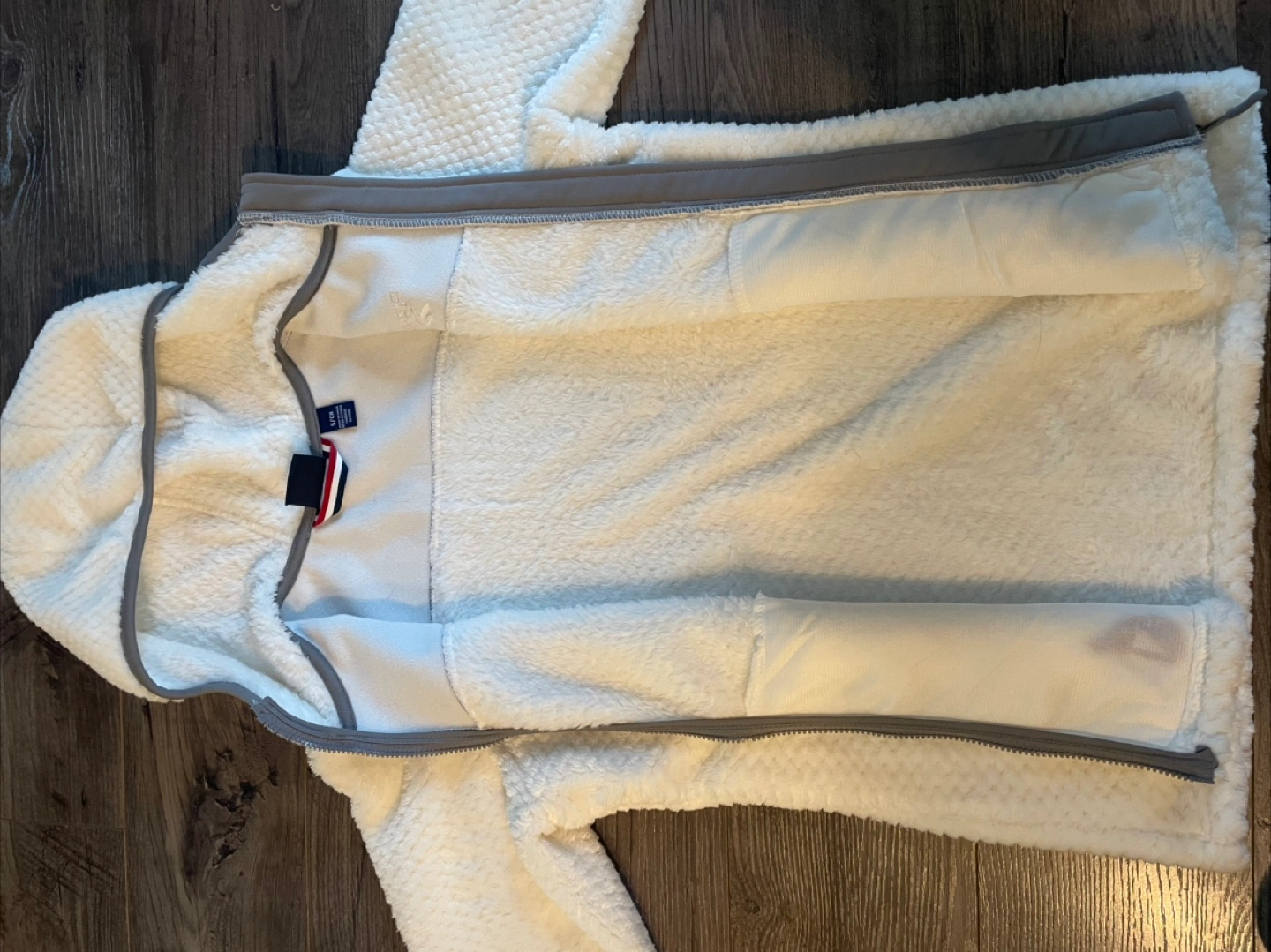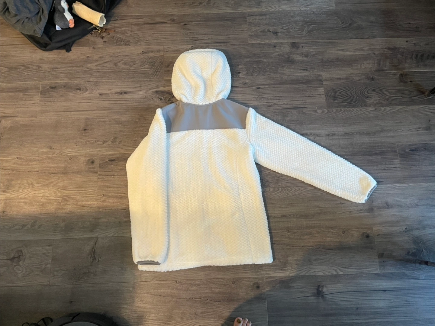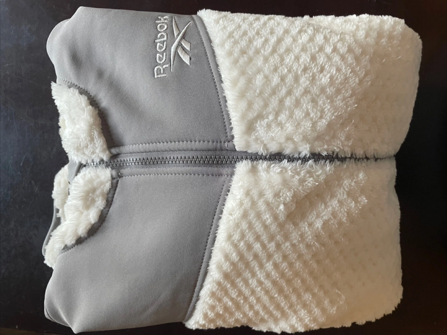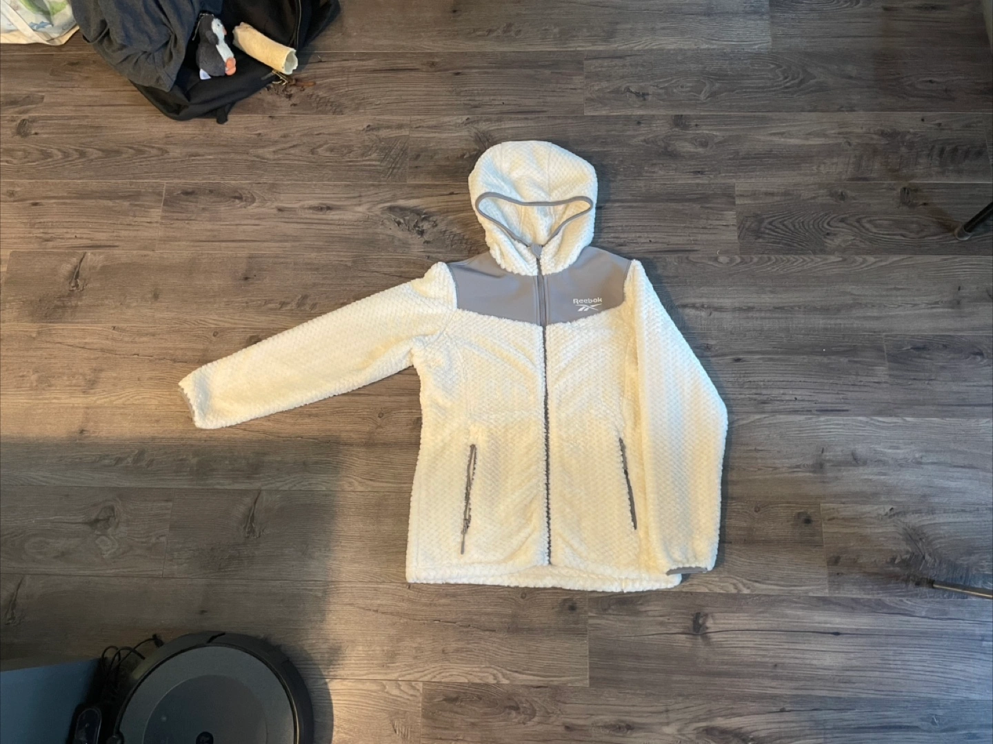 20Worn twice, Cozy up in this Reebok fleece jacket! It's a stylish mix of white and grey, perfect for staying warm on chilly days. The soft fleece material makes it extra comfortable, and the hood is a great addition for extra protection from the elements!