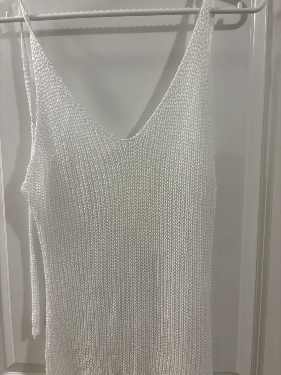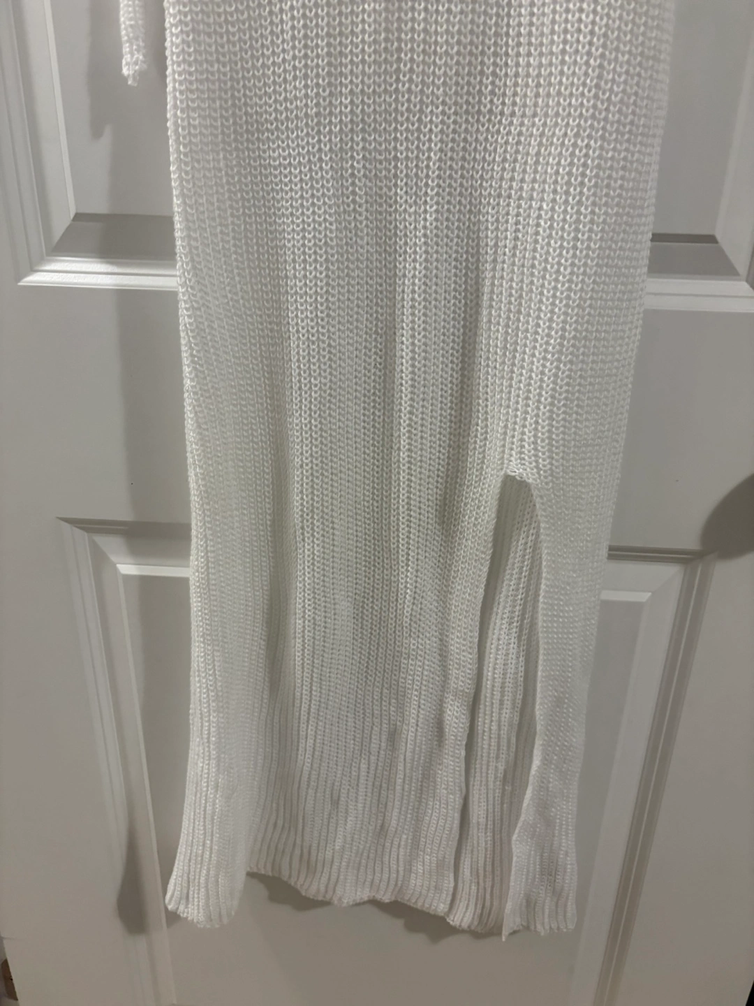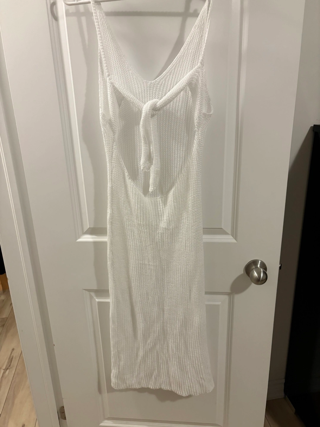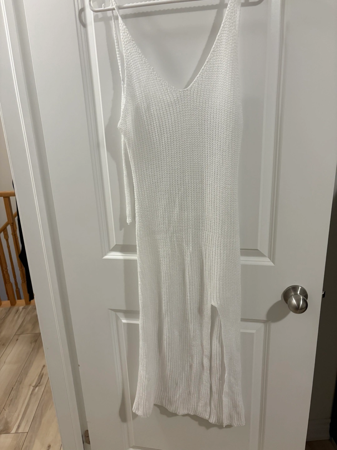 Selling a cute white knit dress! Size L. Never worn, brand new. It has a V-neck and a slit on one side. Perfect for summer or layering or beach cover up.