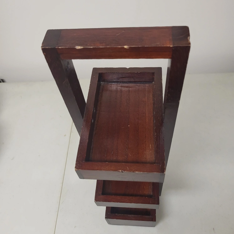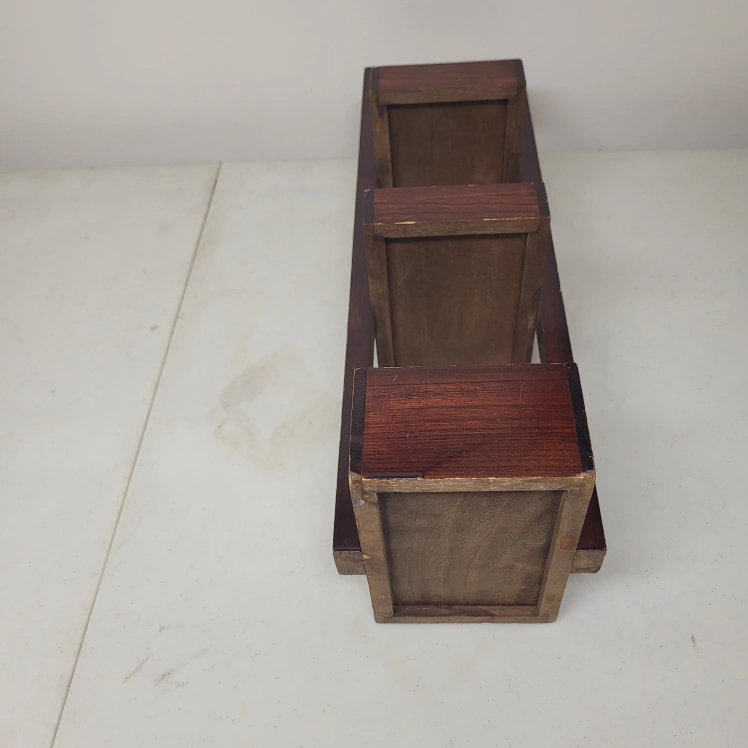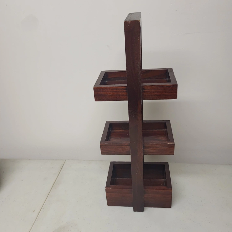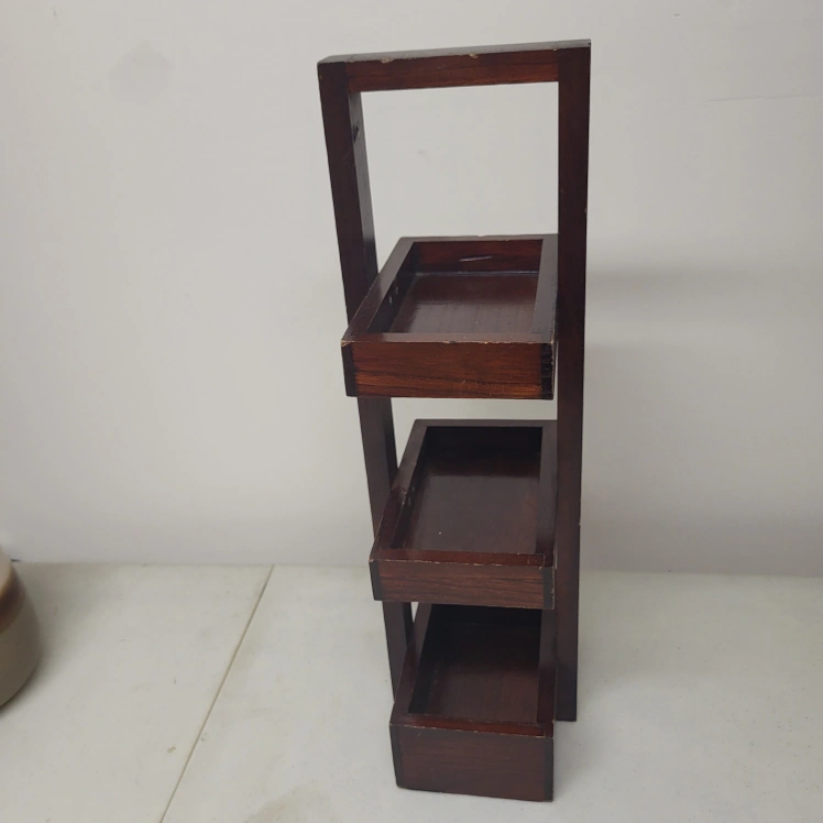 220Here's a charming dark brown wooden shelf with three tiers! It's perfect for adding a touch of rustic elegance to any room. Could be used for plants, trinkets, or anything you'd like to display