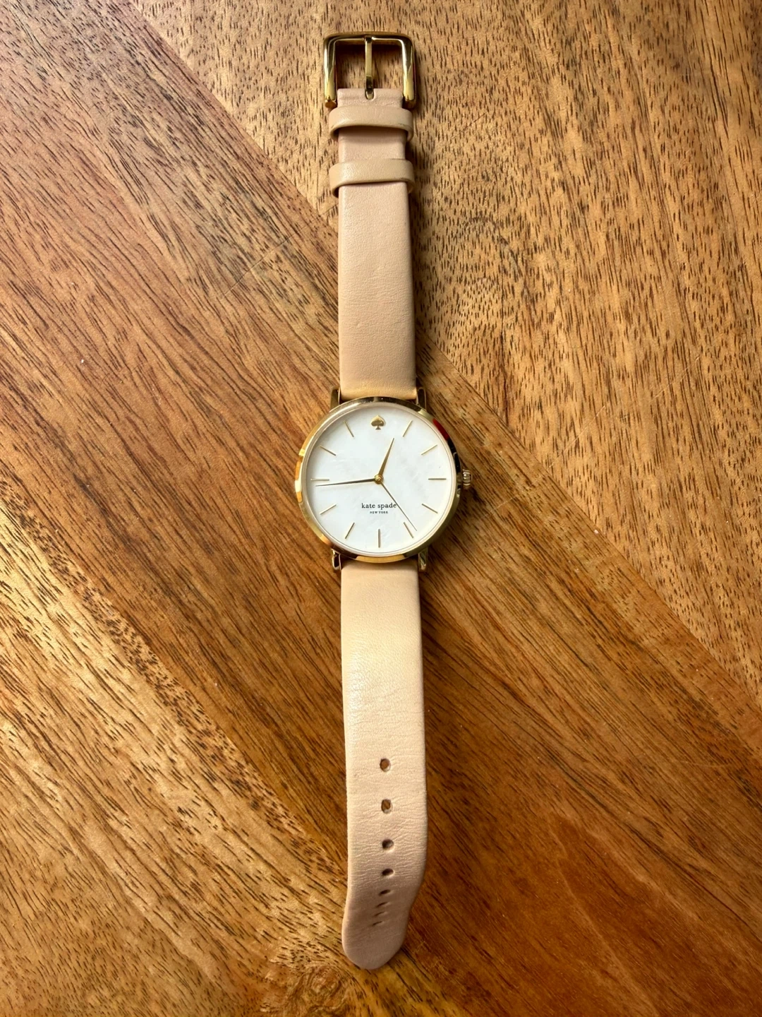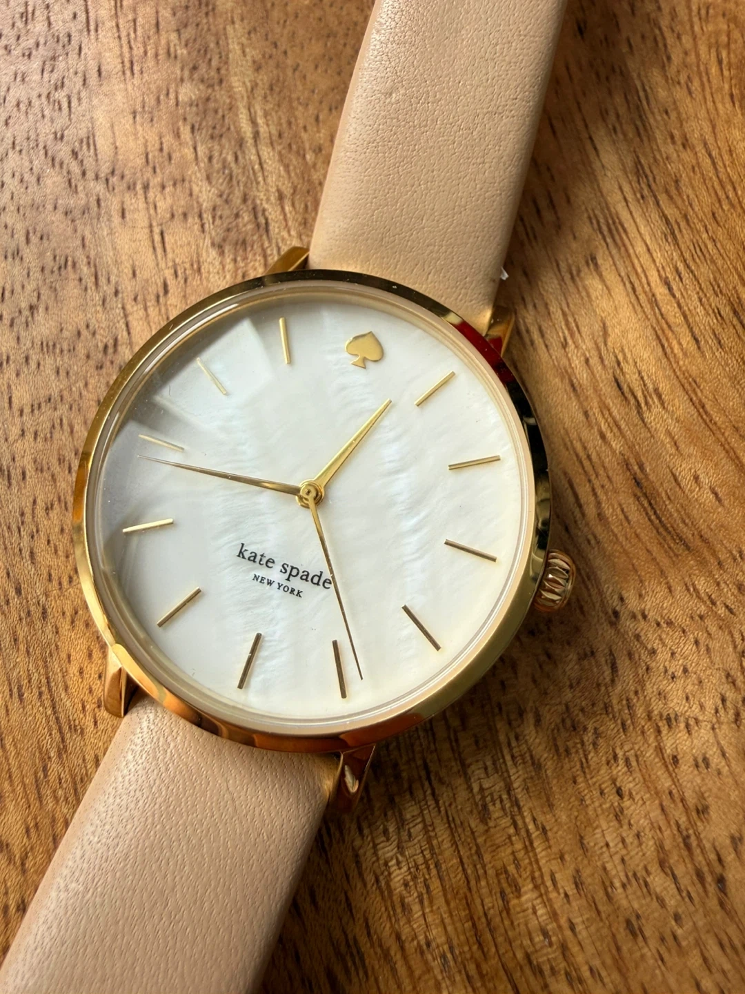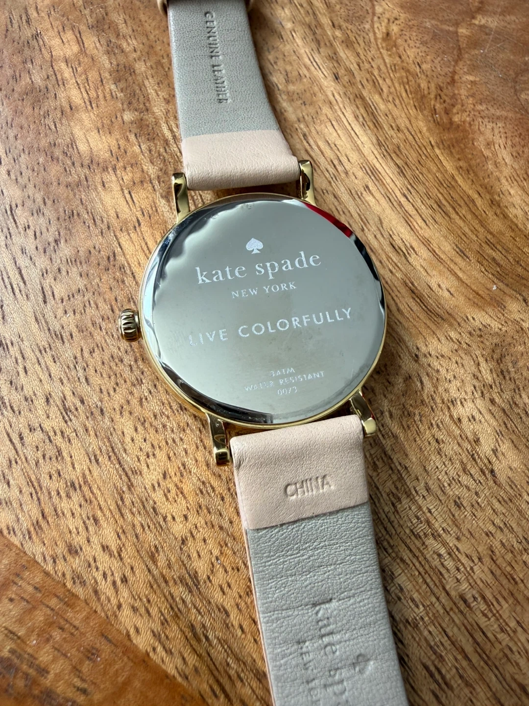 This is a Kate Spade New York watch with a gold-tone case and a light tan genuine leather band. Will need a new battery.
