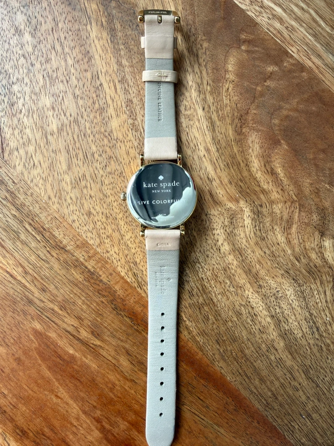 This is a Kate Spade New York watch with a gold-tone case and a light tan genuine leather band. Will need a new battery.