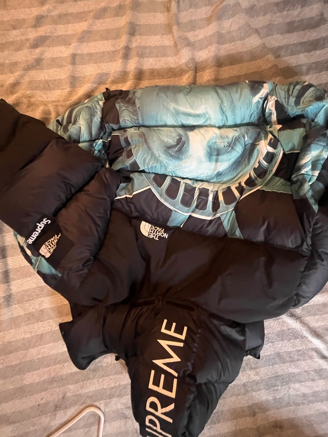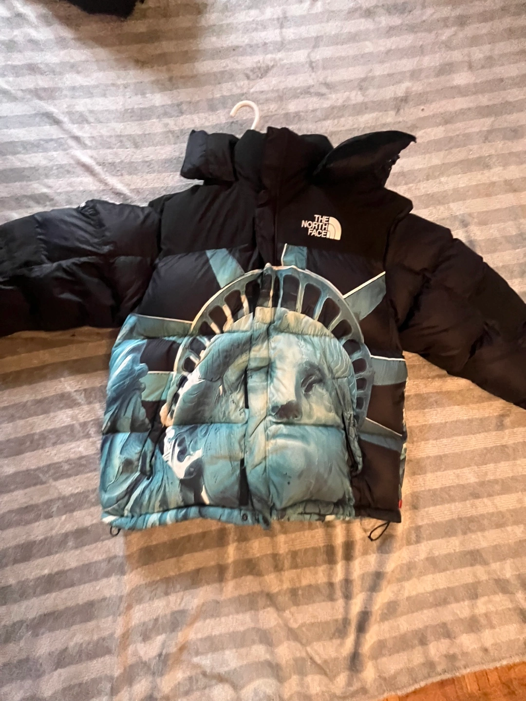 Selling a The North Face x Supreme Baltoro jacket featuring the Statue of Liberty design. It's in great condition and ready to keep you warm this winter! The jacket is black with a blue and white Statue of Liberty graphic.