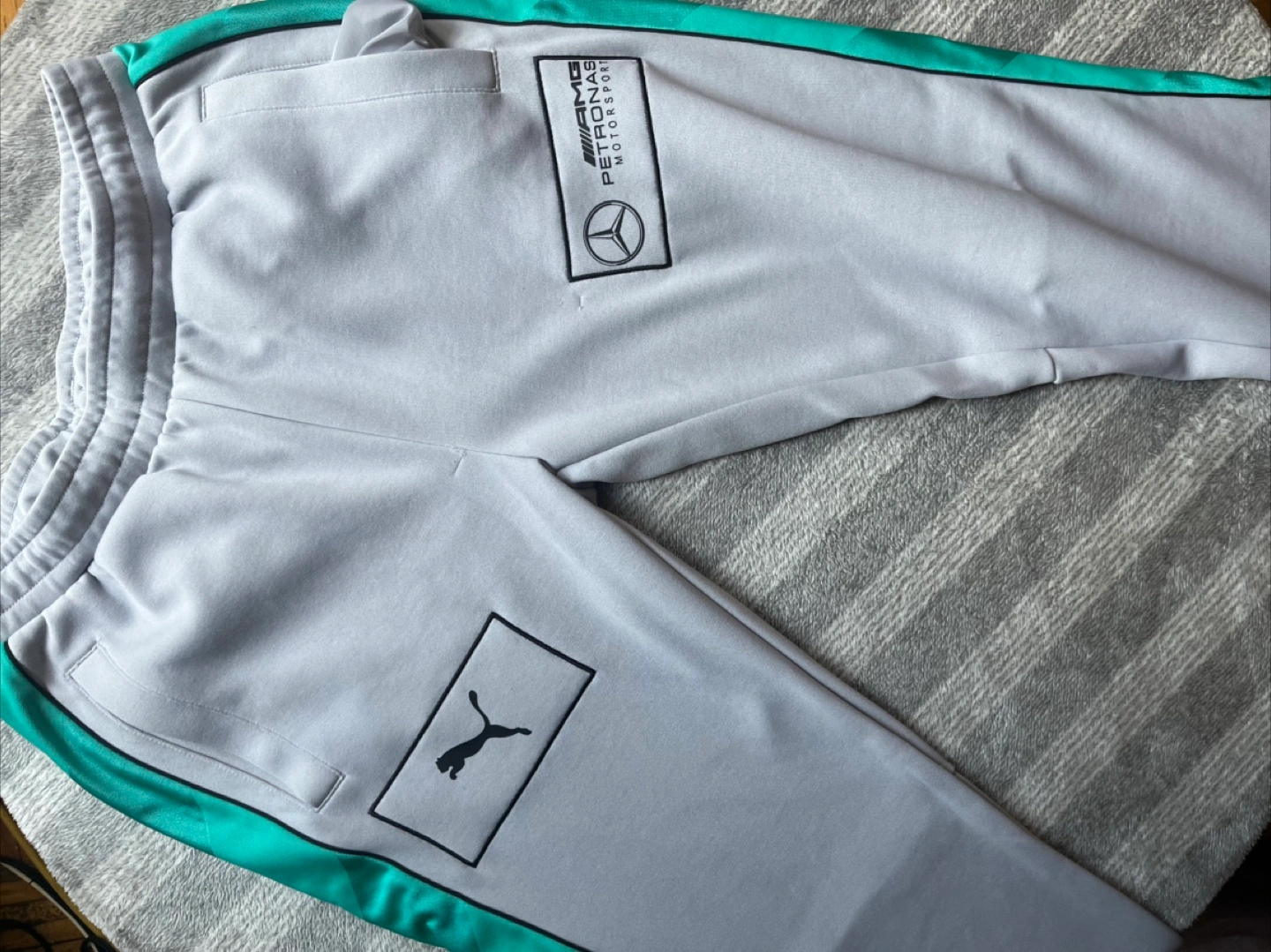 Selling a pair of Puma AMG Petronas Motorsport track pants! They're a light grey colour with a teal stripe down the side. Perfect for lounging or hitting the track!