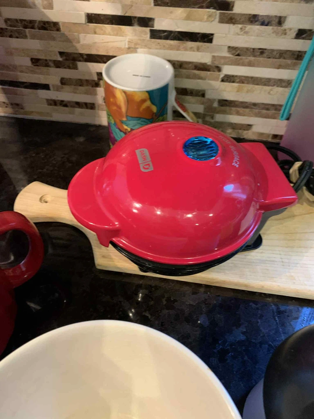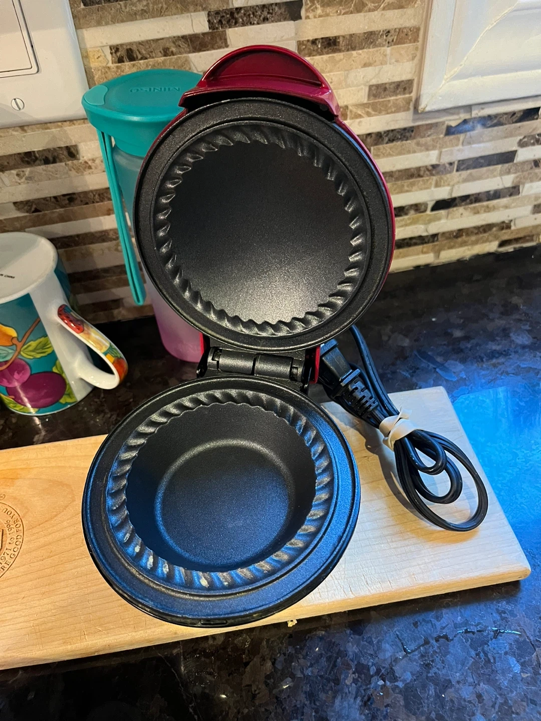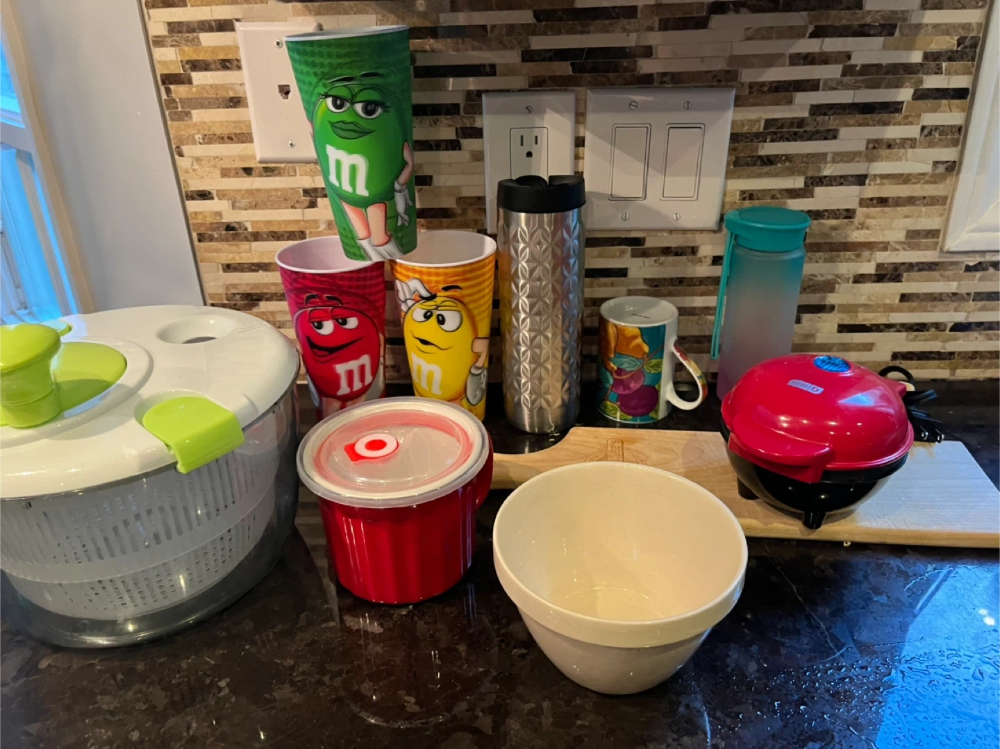 Moving sale. Includes a Mini Pie Maker in red! It's perfect for making individual pies and desserts. It's in great condition and ready for a new home. Salad spinner. Wooden bread board, kids M and M 3d cups (new) and more.