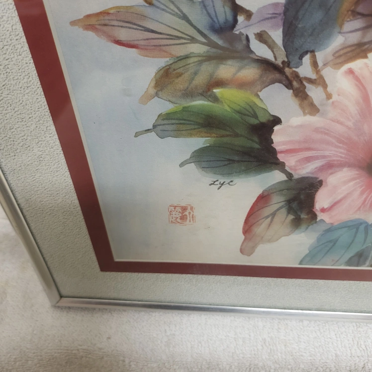 220A lovely framed watercolour painting featuring red, white, and pink hibiscus flowers. The frame is silver with a red border. The artist's signature, 'Lye,' is visible in the bottom left corner. Perfect for adding a touch of floral beauty to any room