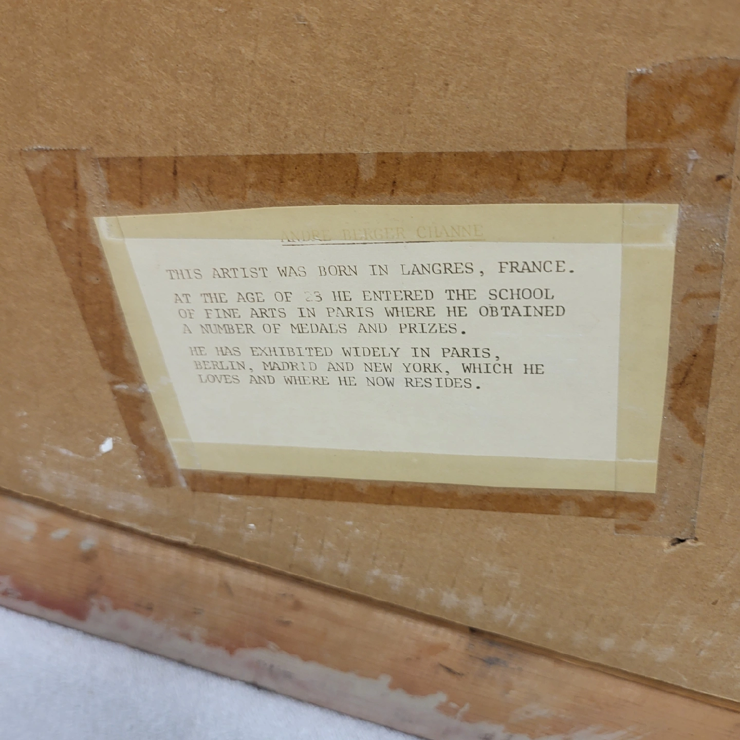 220Framed art by André Burger Channe. The artist was born in Langres, France. At the age of 23 he entered the School of Fine Arts in Paris where he obtained a number of medals and prizes. He has exhibited widely in Paris, Berlin, Madrid and New York, which he loves and where he now resides 33 x 27 in