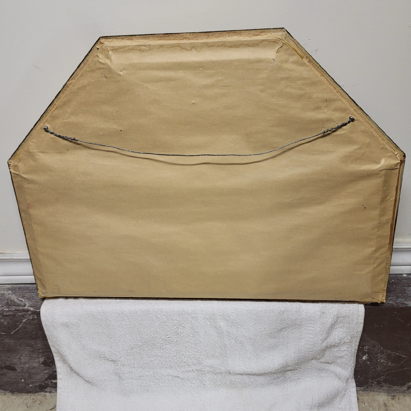 220Selling a framed piece of fan art. It features a delicate lace design surrounding a detailed scene, complemented by a gold-toned, ornate fan. The frame itself has a unique, multi-sided shape, adding to its vintage charm. 19 x 26 x 3 inches