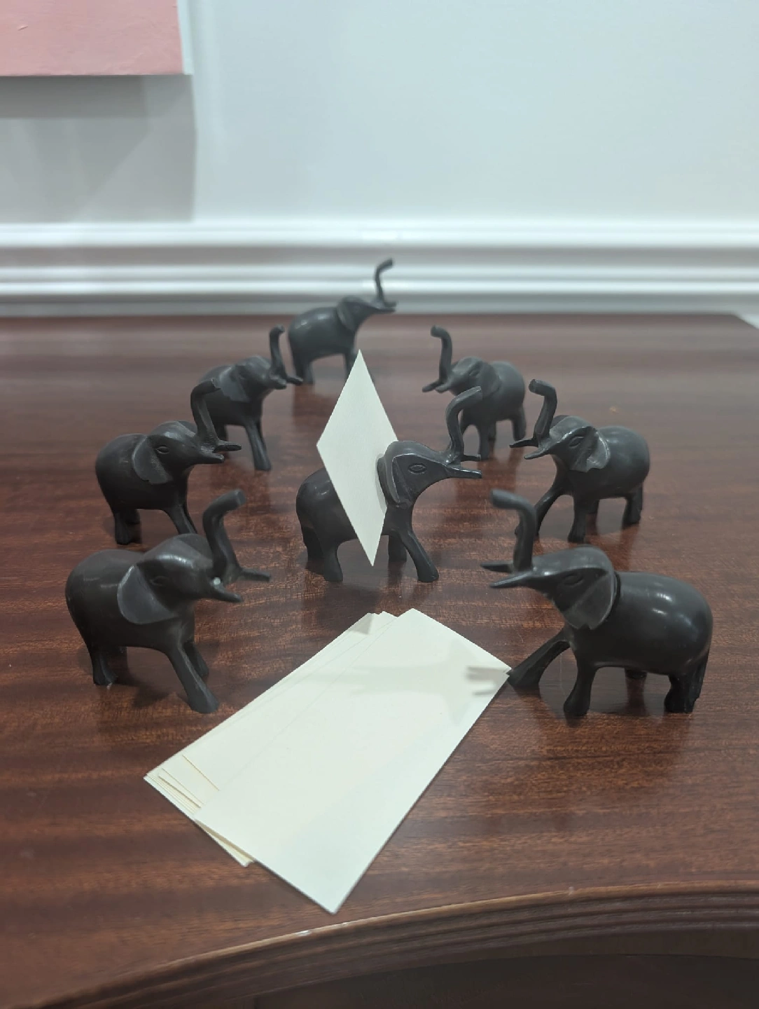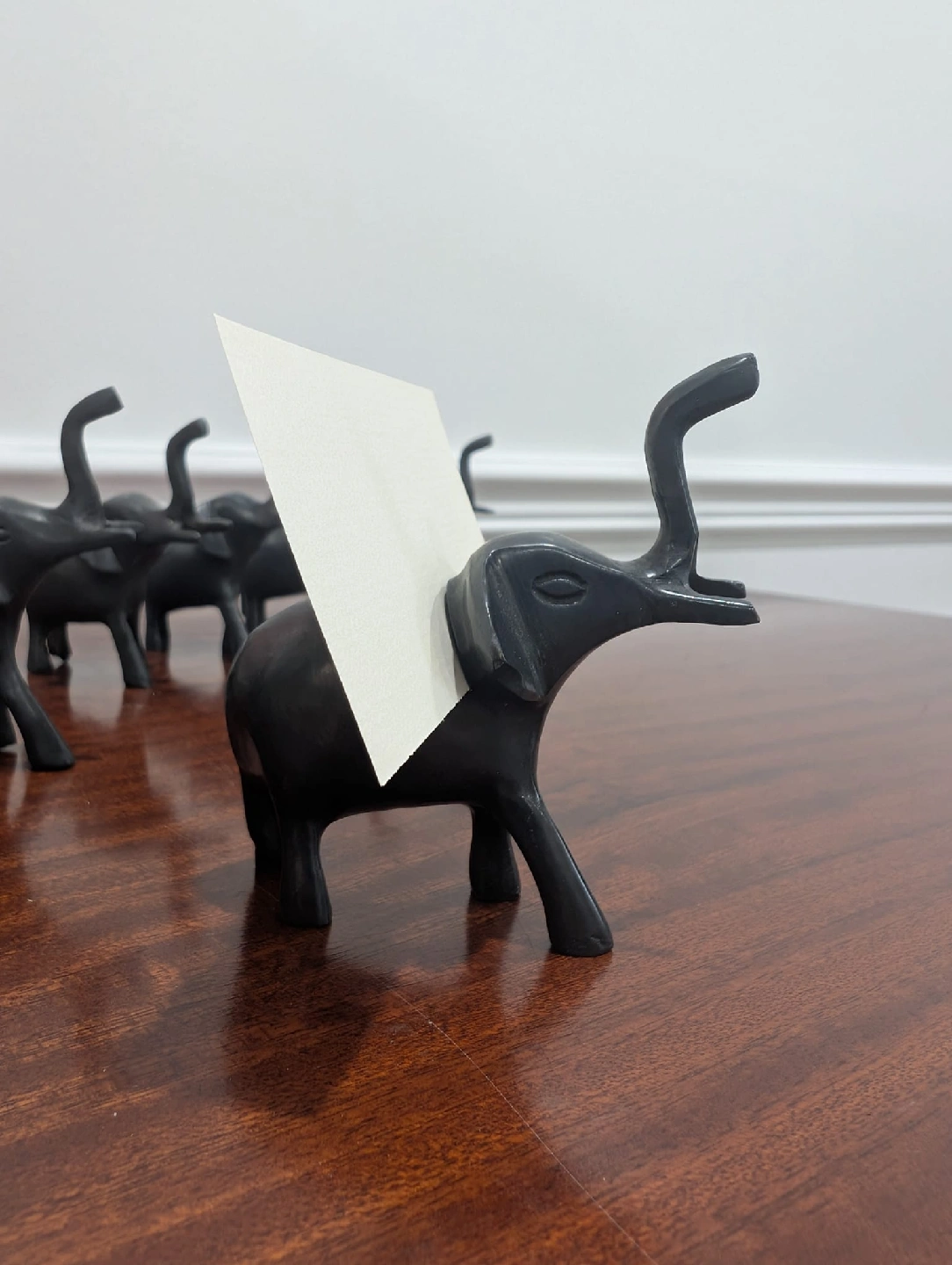 Selling a set of eight cute black elephant figurines! They're in great shape and would look lovely on a shelf or desk and then used at the dinner table for a party. Each elephant is about 2-3 inches.