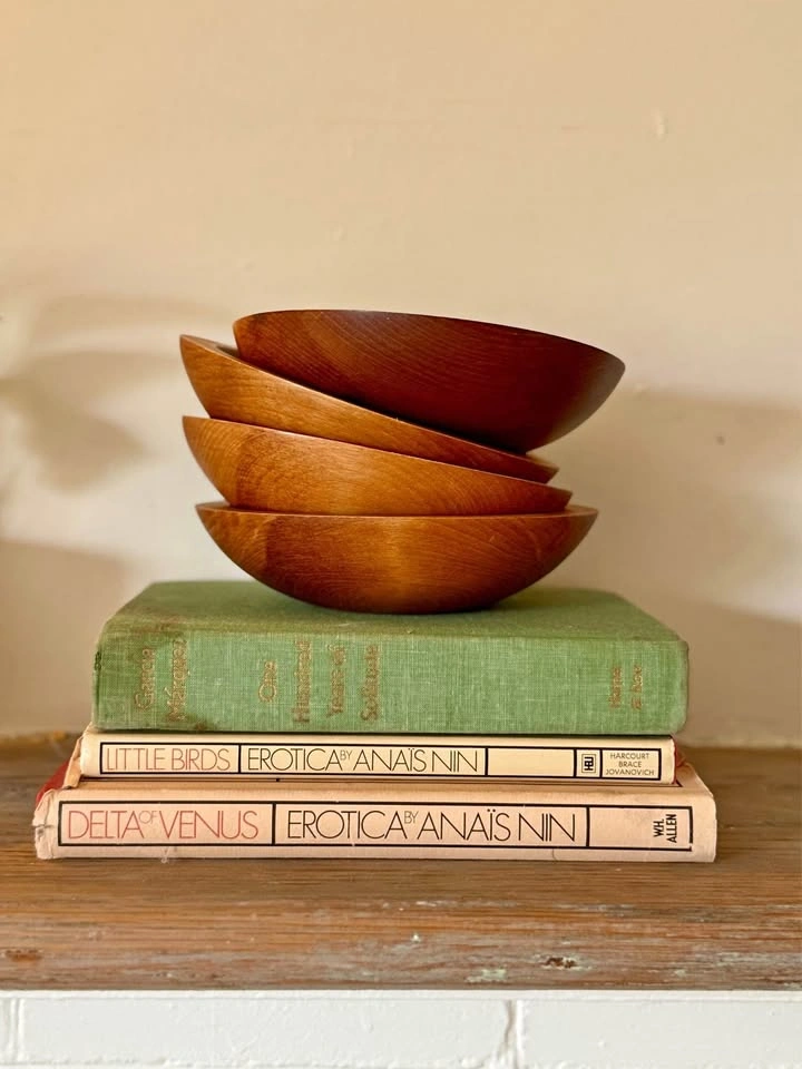 Baribocraft Canada Wooden Maple Bowl Set 4 Small Side Bowls. Salad Bowls Snack Bowl Mid Century Great patina and nice teak finish on the wood. Looks wonderful as a decorative accent on a bookshelf, table or fireplace mantle. Very structural in form when stacked on top of each other and used as decor. 6.25” x 7” x 1.5“ (height) Baribocraft was a Canadian company known for producing woodenware, particularly bowls, from the 1930s through the 1970s. These bowls were often made from Canadian maple and were popular for serving and decorative purposes. The bowl has a warm, natural wood grain and a simple, rounded shape, characteristic of the brand's style Vintage wooden bowls like this are often sought after for their craftsmanship and retro appeal. They can be used as fruit bowls, salad bowls, or decorative pieces. Porch pick up Christie St and St. Clair West Ave. If ad is up, it's available. $35. Cash only.