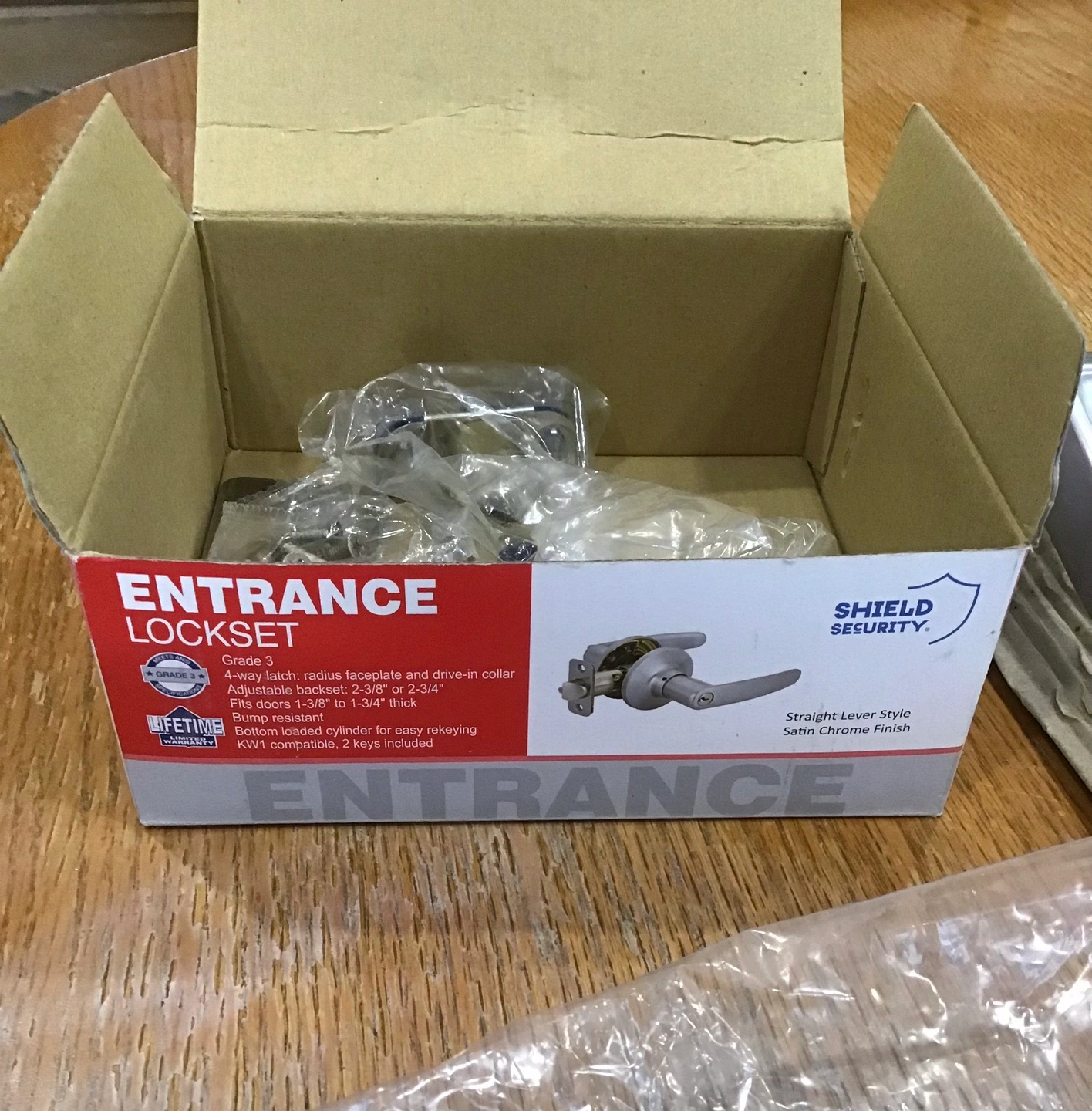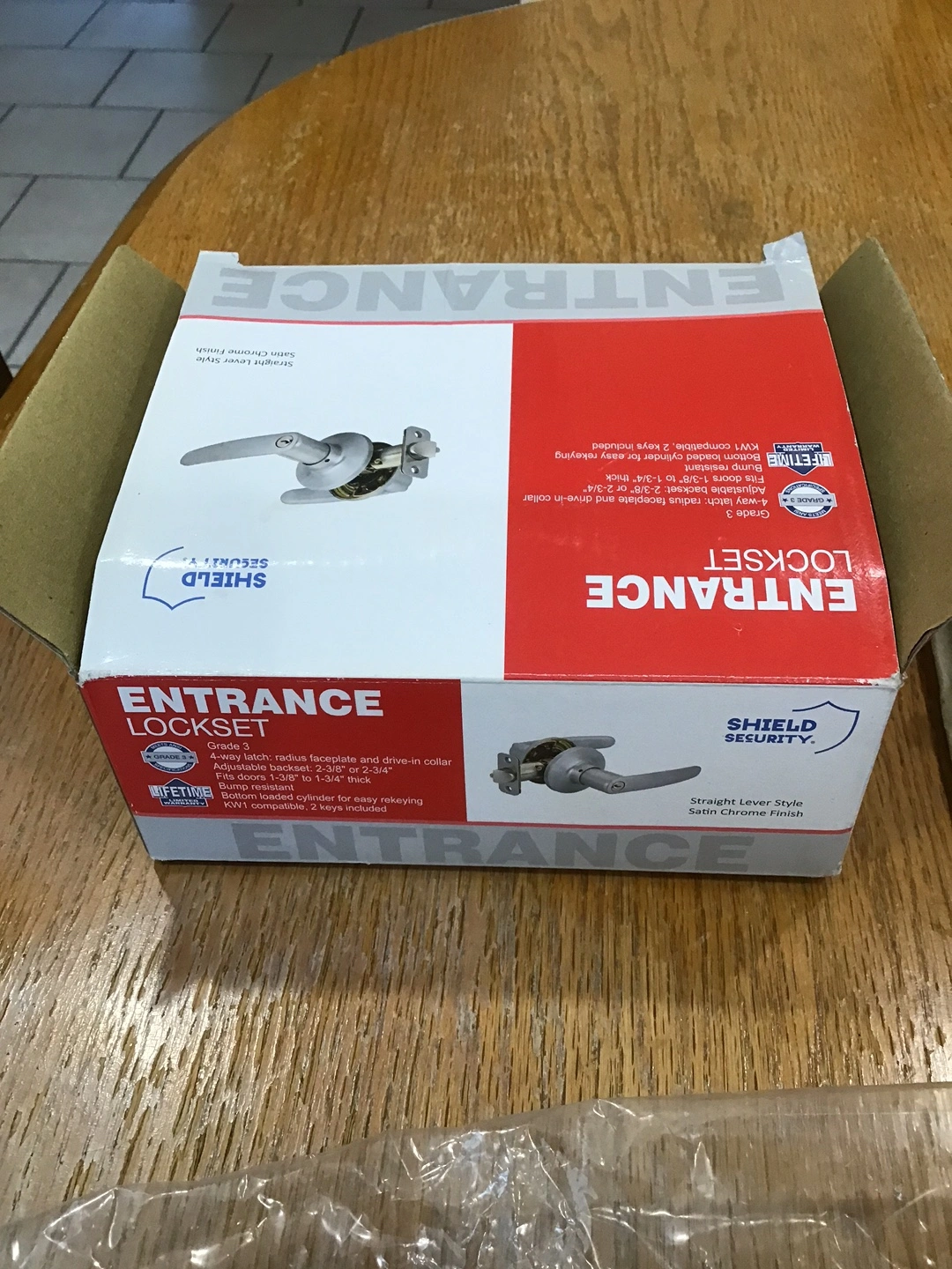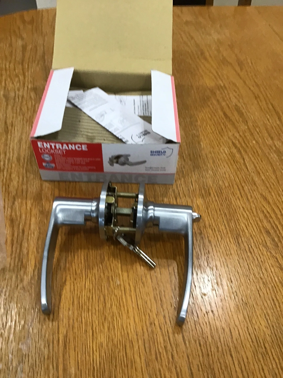 Selling a brand new Shield Security Entrance Lockset in a straight lever style with a satin chrome finish! It's still in the box and includes the necessary components.