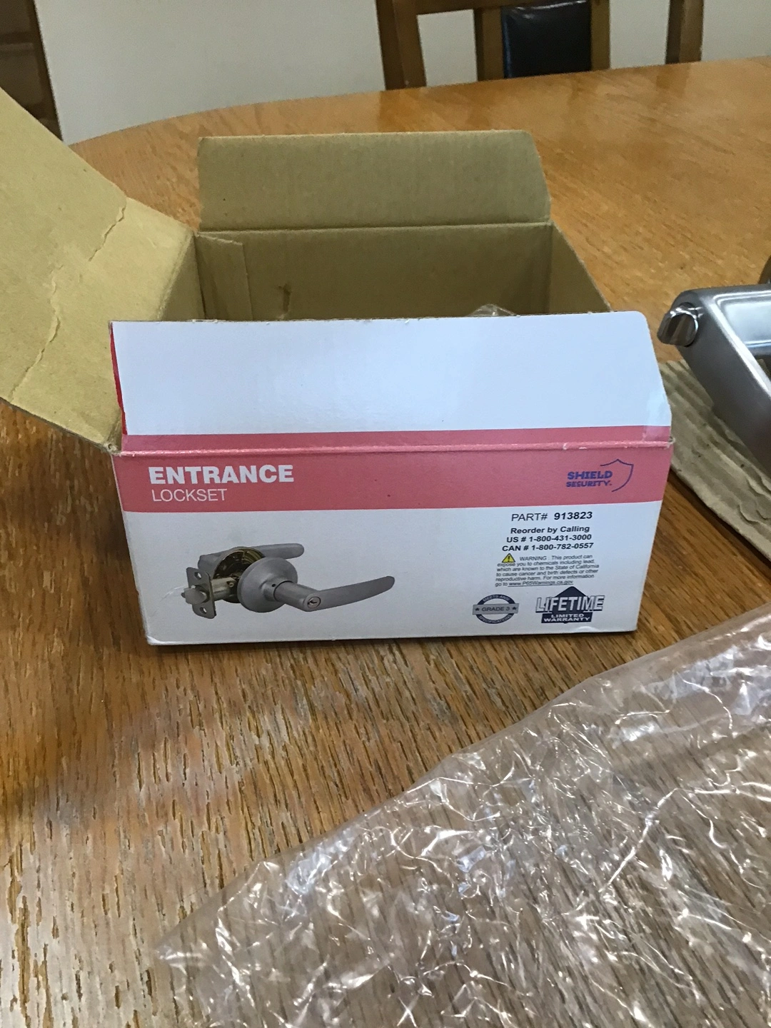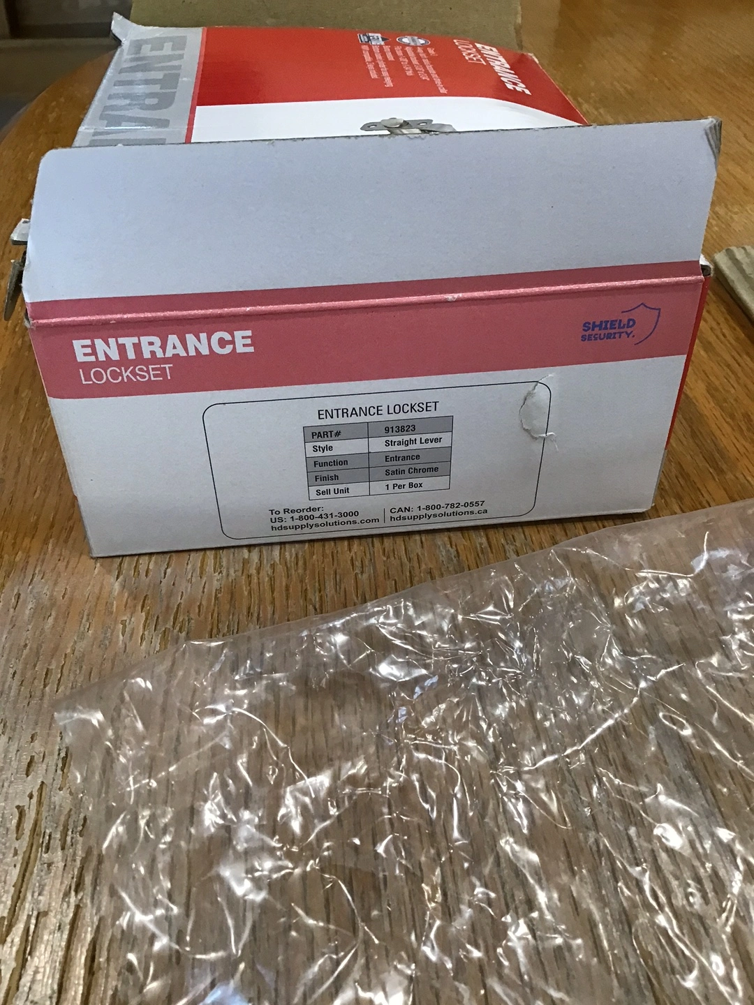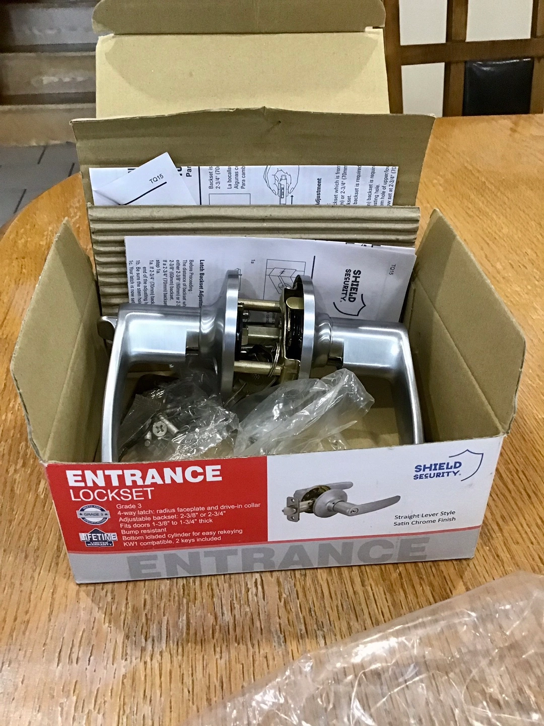 Selling a brand new Shield Security Entrance Lockset in a straight lever style with a satin chrome finish! It's still in the box and includes the necessary components.