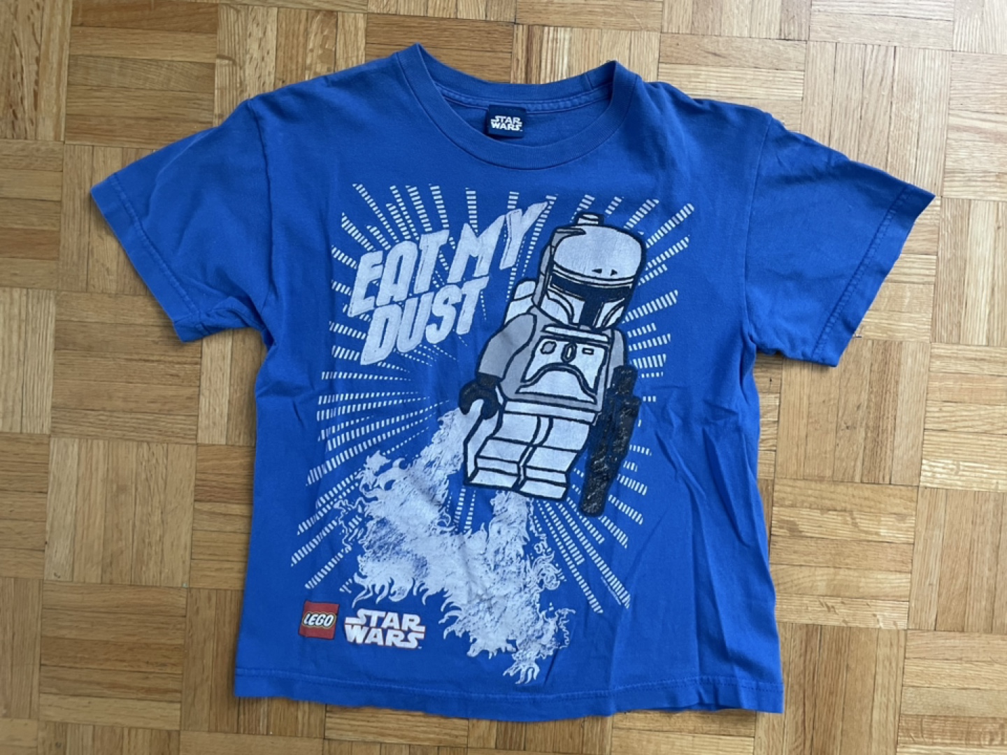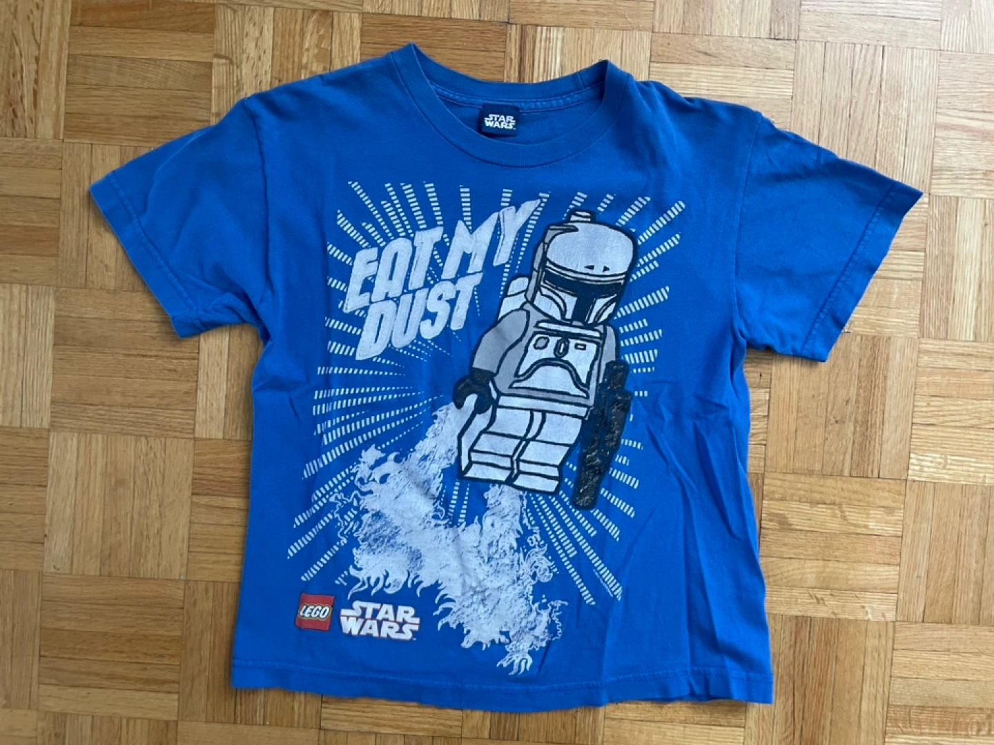 This is a blue LEGO Star Wars t-shirt featuring a Boba Fett design with the words "EAT MY DUST" on it. Great for any young Star Wars fan!