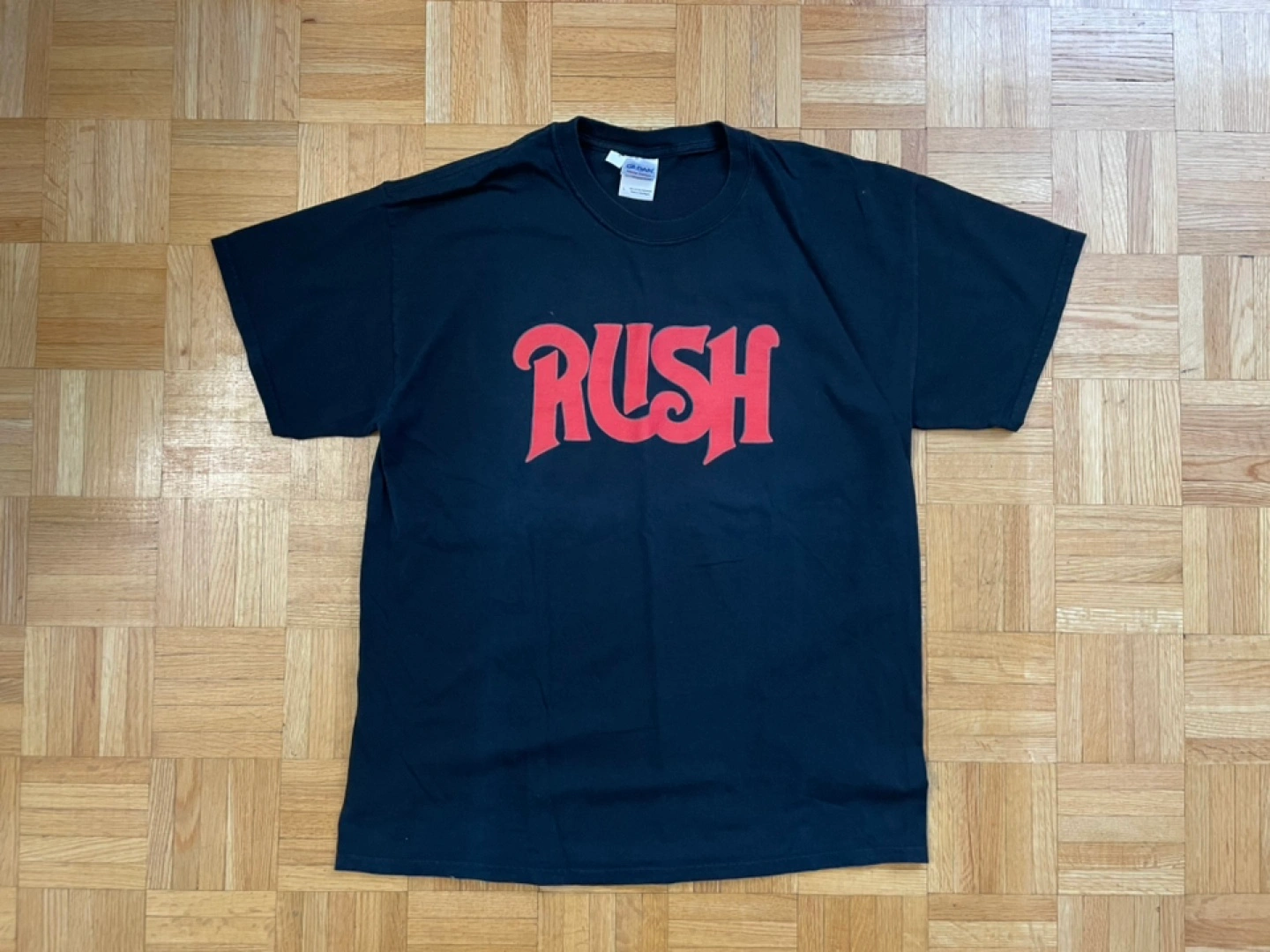 Selling a Gildan T-shirt featuring the band Rush. The shirt is black with a red Rush logo on the front. It's in great shape and ready for a new home!