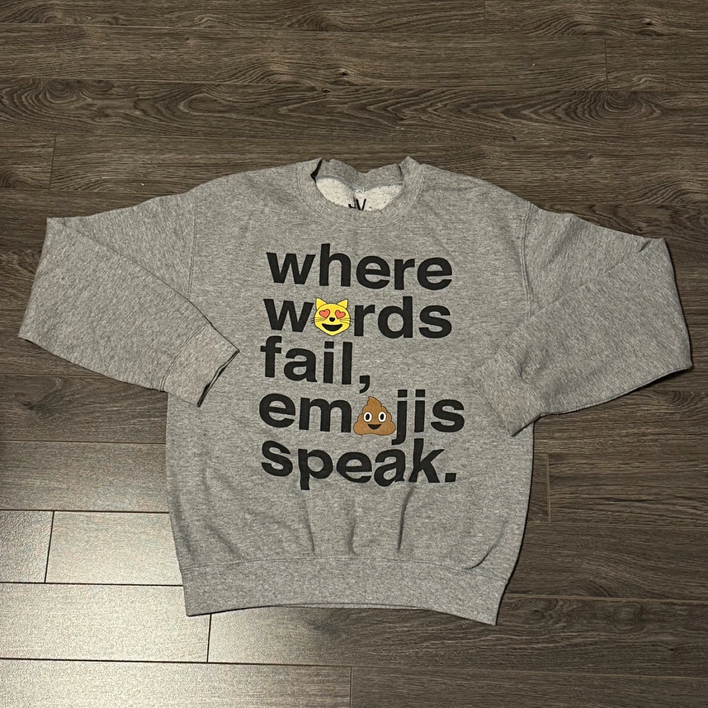 Selling a grey sweatshirt with the saying "where words fail, emojis speak" printed on the front! It's in great condition and super comfy. Size is a medium.