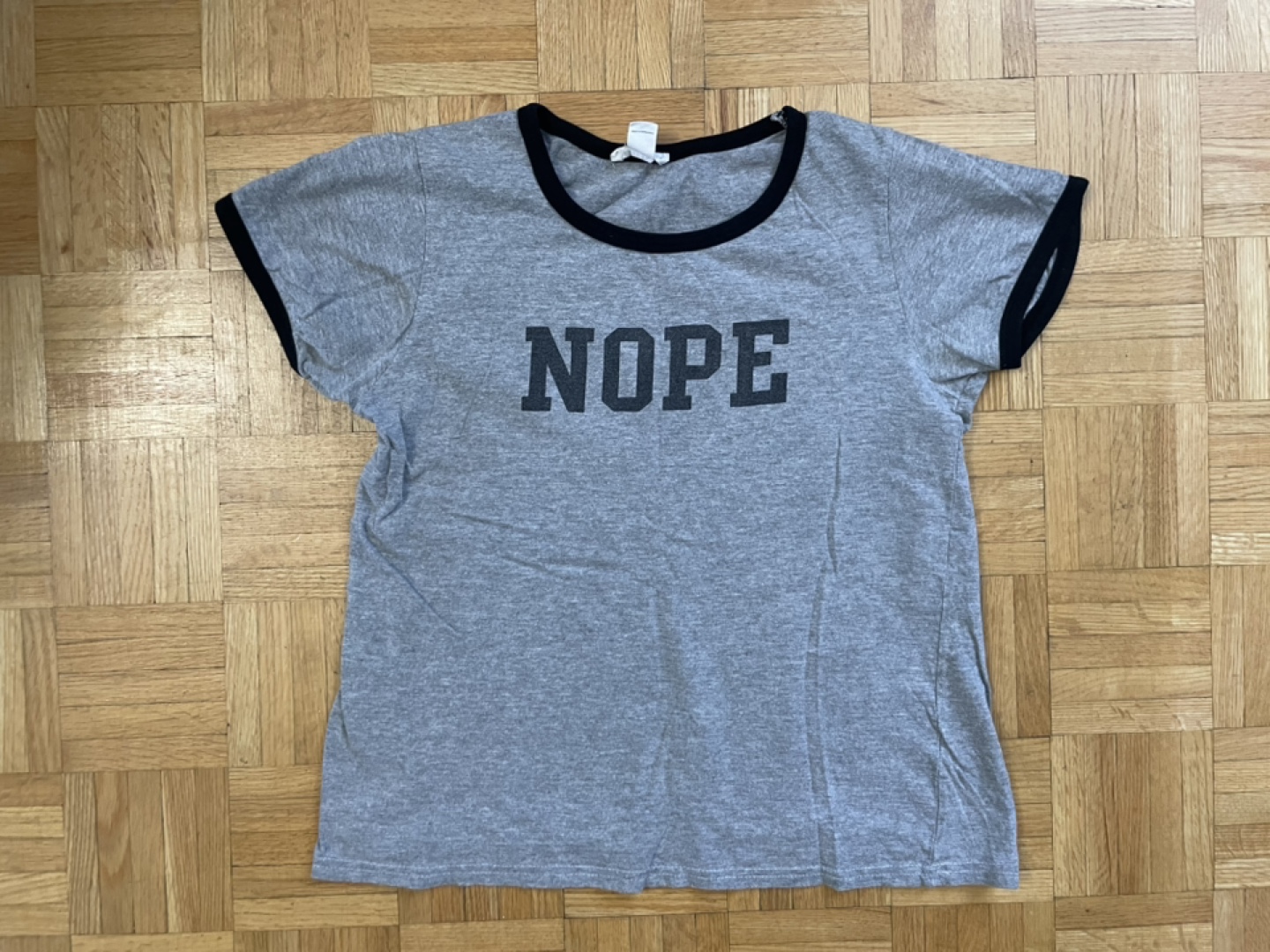 Selling a grey t-shirt with the word 'NOPE' printed on the front. It has black trim around the neck and sleeves. It's in good condition and ready for a new home!