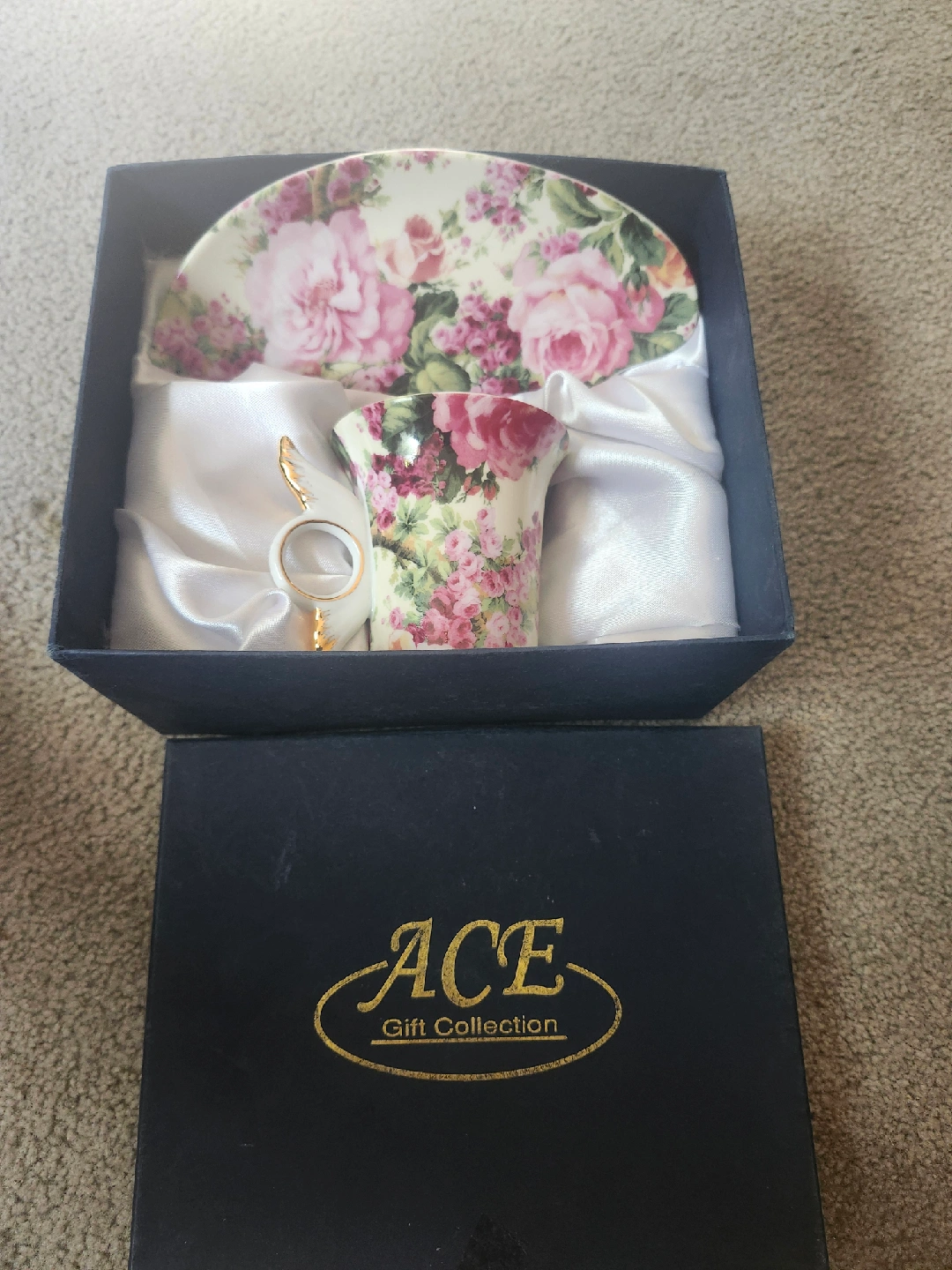 Selling a beautiful Emelie Chintz fine porcelain cup and saucer set by Allison L.L. It comes in its original box from the ACE Gift Collection. The set features a lovely floral design with pink roses on a white background. Perfect for tea time or as a decorative piece i have 2 of them 25 each.