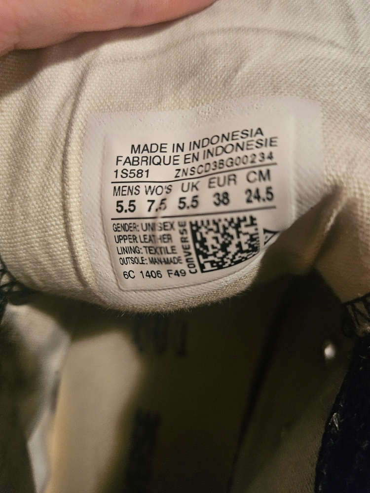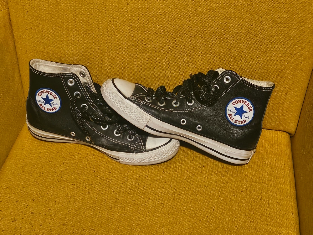 Selling a pair of Converse All Star high top sneakers in black leather! They're in good condition but used condition, size is US 5.5 mens and 7.5 womens, ideal for summer and fall.