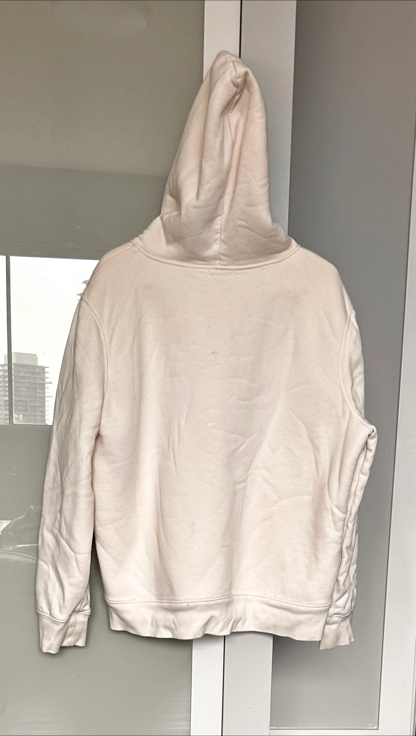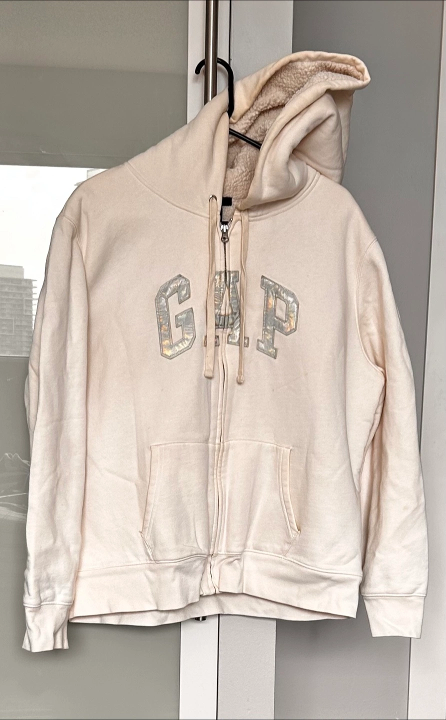 Cozy up in this cream-coloured GAP hoodie! It features a soft sherpa lining, perfect for chilly Canadian weather. It's a zip-up style and size XXL.