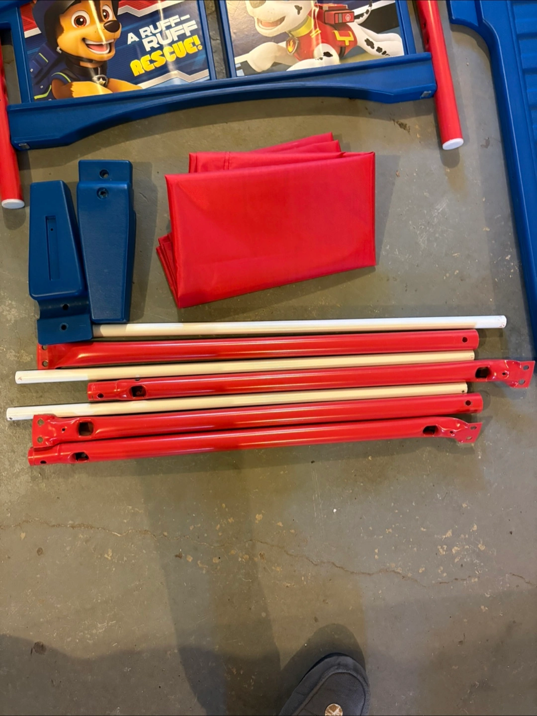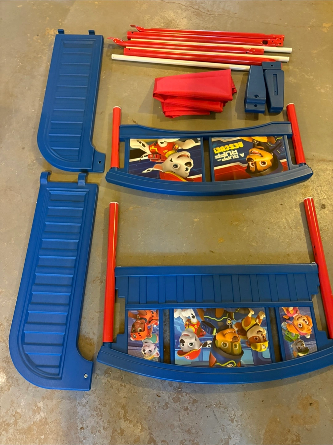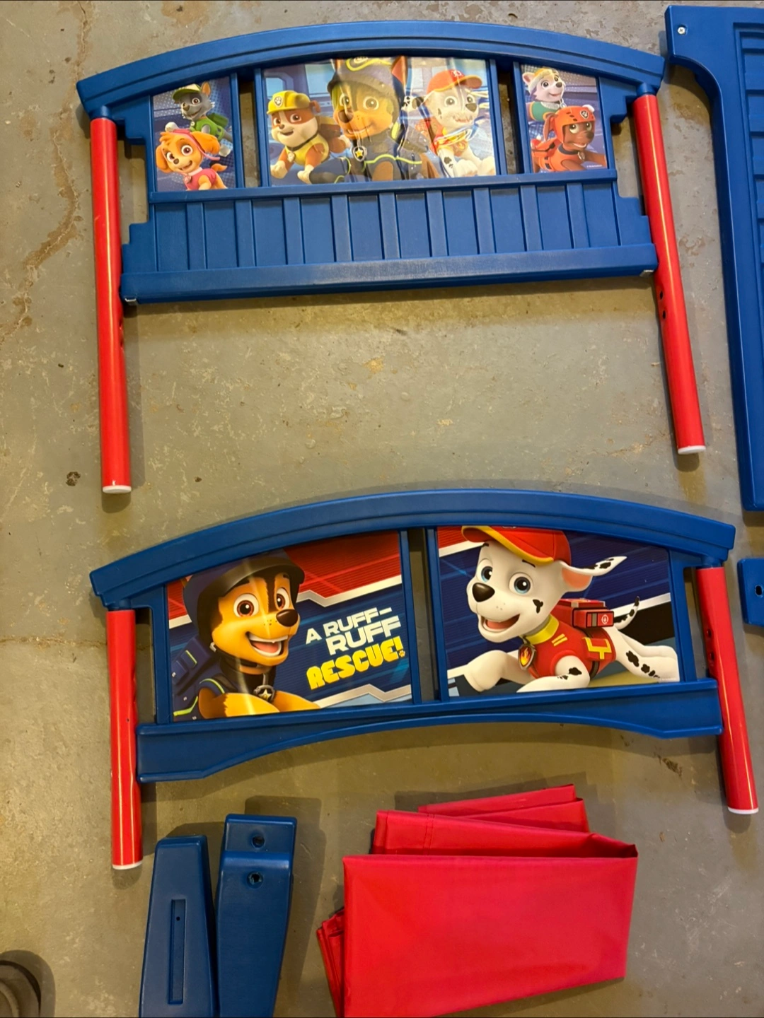 Paw Patrol toddler bed, perfect for transitioning your little one from a crib! It features a fun Paw Patrol design and includes a tent to make bedtime even more exciting. The bed is in great condition and ready for a new home