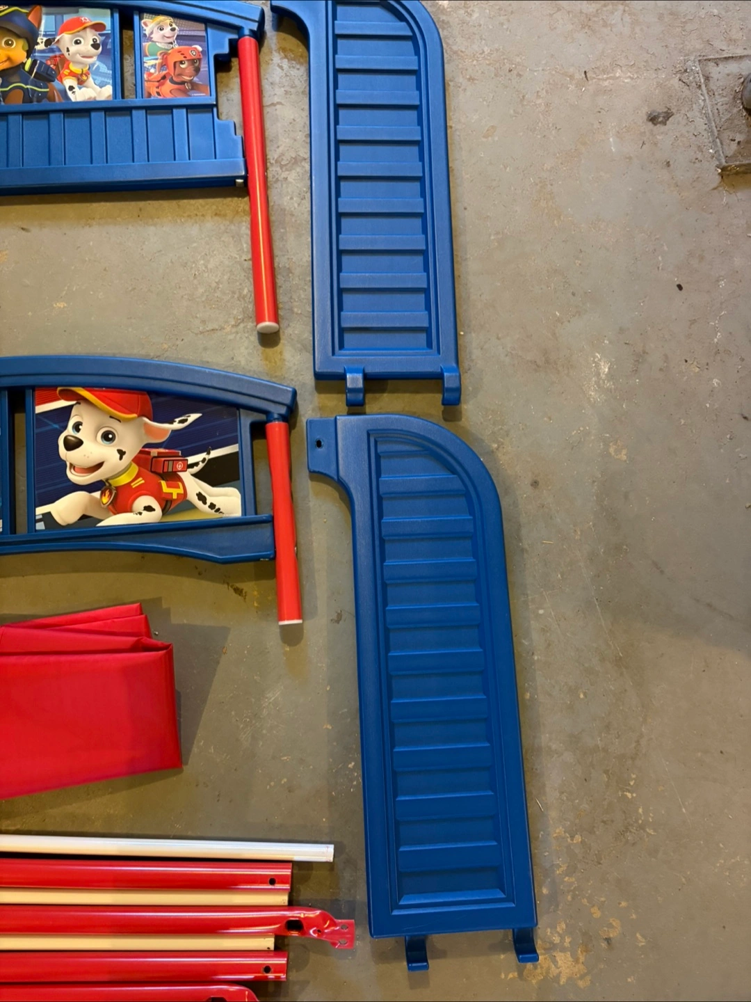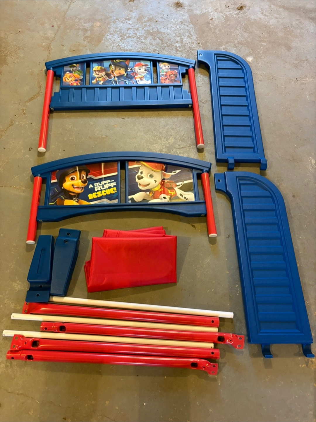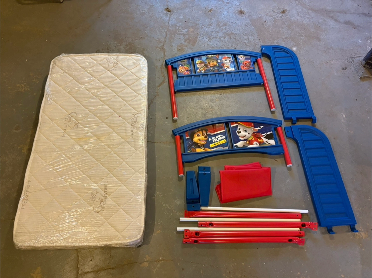 Paw Patrol toddler bed, perfect for transitioning your little one from a crib! It features a fun Paw Patrol design and includes a tent to make bedtime even more exciting. The bed is in great condition and ready for a new home