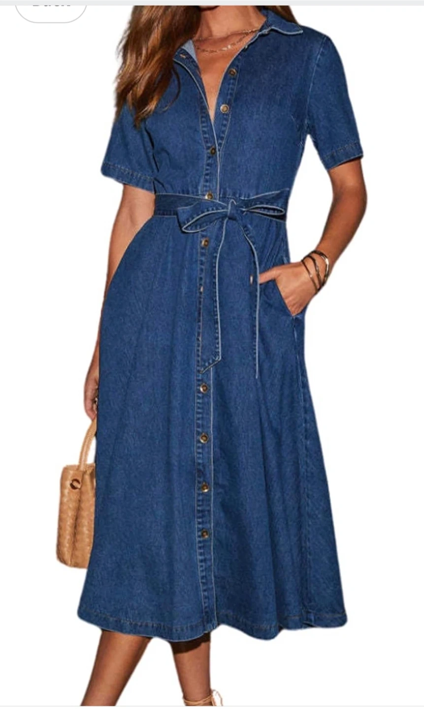 A stylish denim midi dress, perfect for a casual day out! It features a button-up front and a cute tie belt to cinch the waist. The dress has short sleeves and a classic collar, giving it a timeless look.