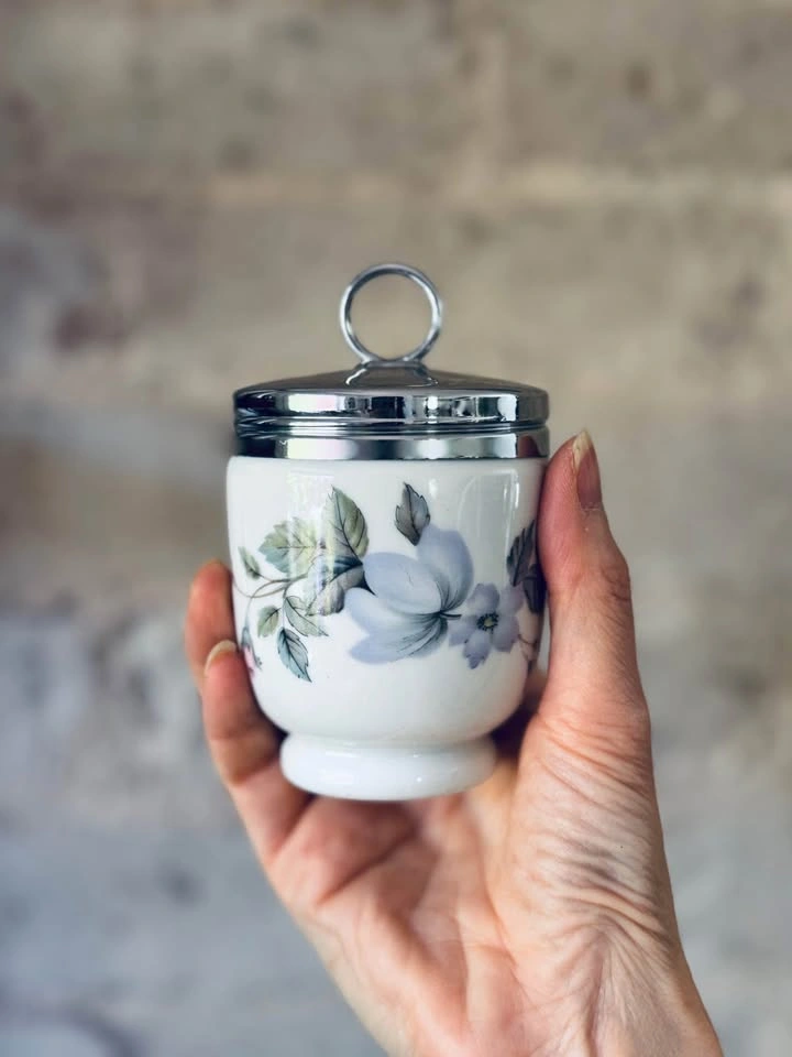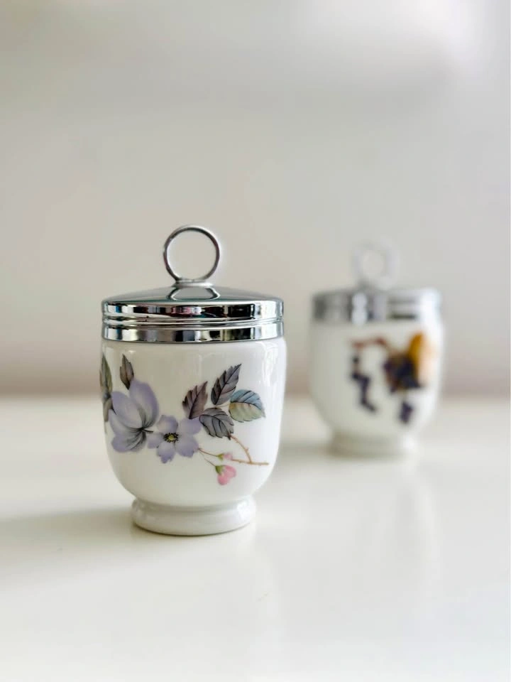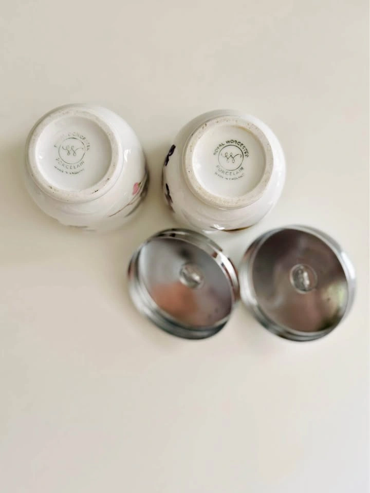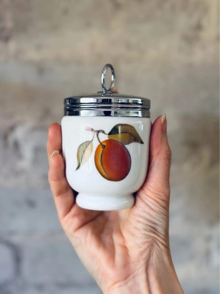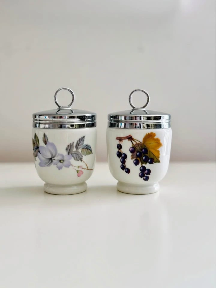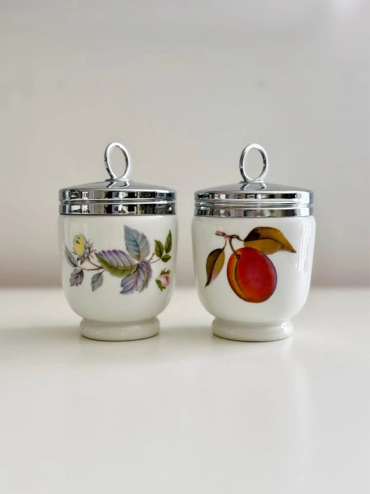 Royal Worcester "Evesham Vale" Porcelain Egg Coddlers - Set of 2 Elevate your breakfast with this vintage set of two Royal Worcester "Evesham Vale" porcelain egg coddlers. A classic and sought-after pattern, "Evesham Vale" features a beautiful medley of hand-painted fruits. While they are fully functional for making a perfect coddled egg, they are also beautiful and versatile. Use them for storing small trinkets, holding salt and pepper on the table, or simply as charming decorative pieces for your kitchen. An ideal addition for collectors of fine china or anyone who appreciates timeless kitchenware. Made in England. Royal Worcester, Evesham Vale, Evesham, porcelain, bone china, egg coddler, egg cup, vintage, antique, collectible, British, England, kitchenware, tableware, breakfast, brunch, green trim, fruit pattern, oven-to-table, trinket box, home decor, cottagecore, serving dish, unique gift.