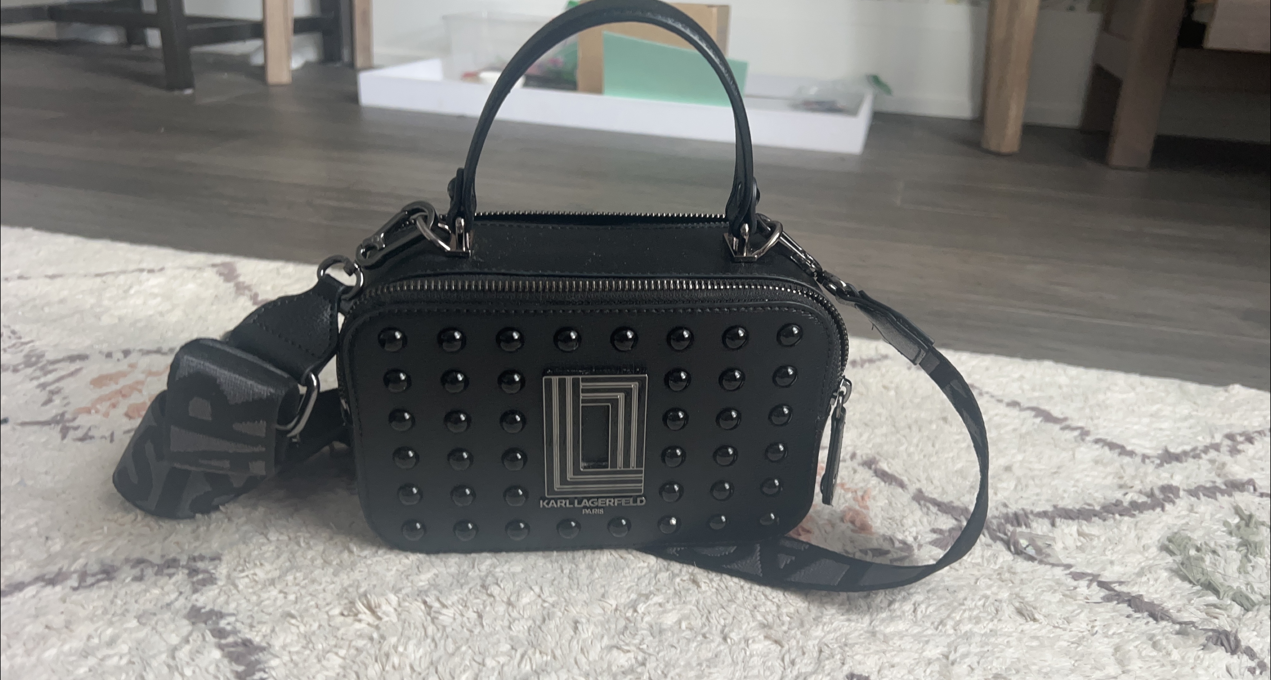 This is a stylish Karl Lagerfeld Paris bag in black. It features a studded design and a logo on the front. The bag includes a shoulder strap for easy carrying. Perfect for adding a touch of edgy sophistication to any outfit