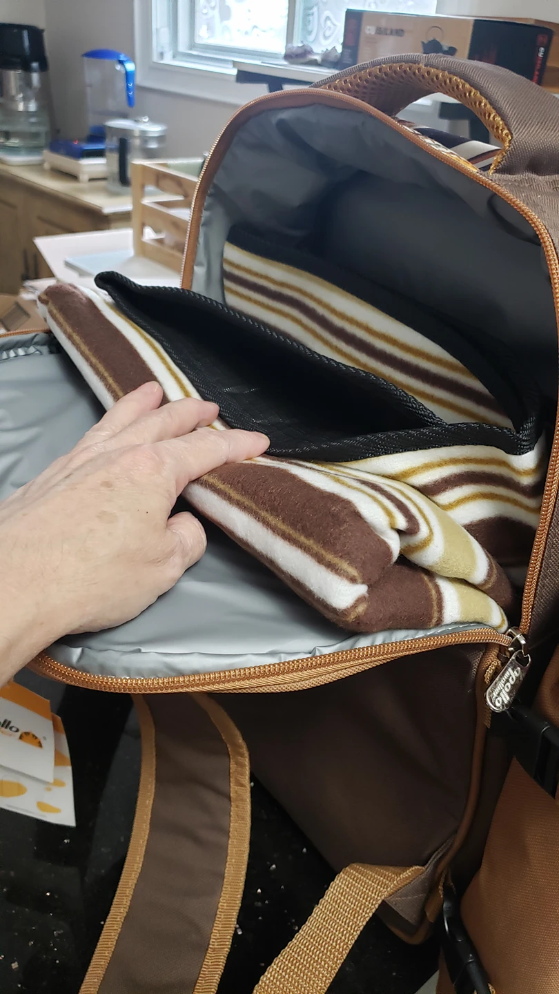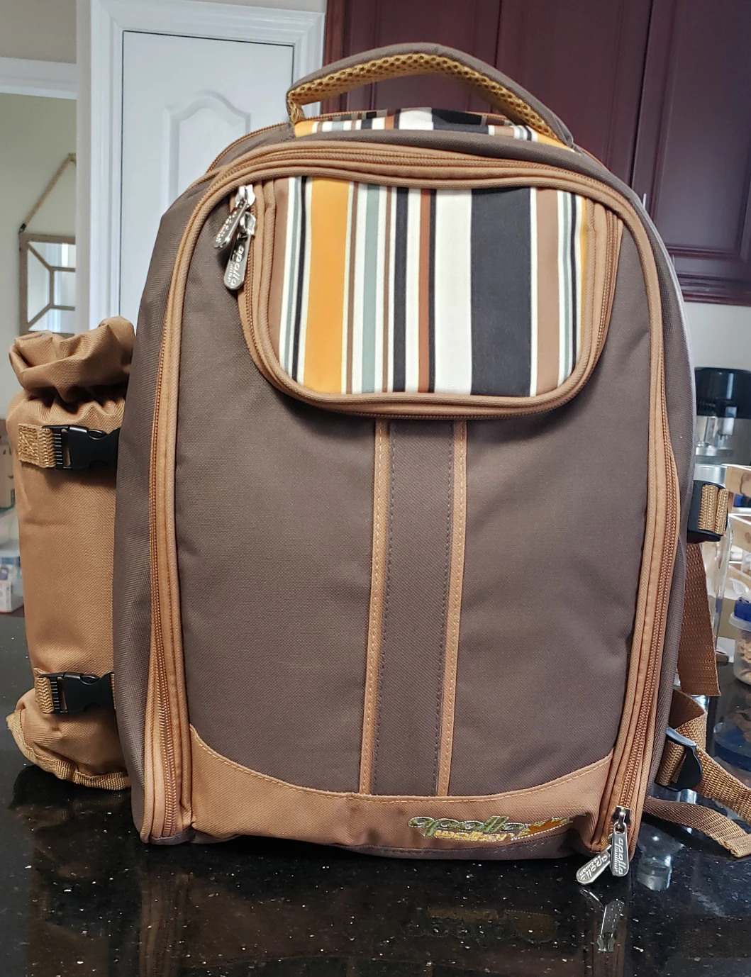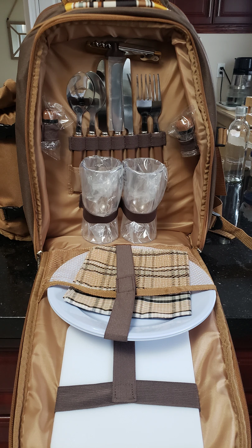 Apollo Walker Picnic Backpack bag for 2 people with cooler compartment, detachable bottle/wine holder, waterproof back fleece blanket 45" x 53", 2 plastic wine glasses, 2 plastic dinner plates, stainless steel cutlery, washable cotton napkins, plastic salt and pepper shakers, cutting board, stainless steel corkscrew/bottle opener and 1 cheese/butter knife.